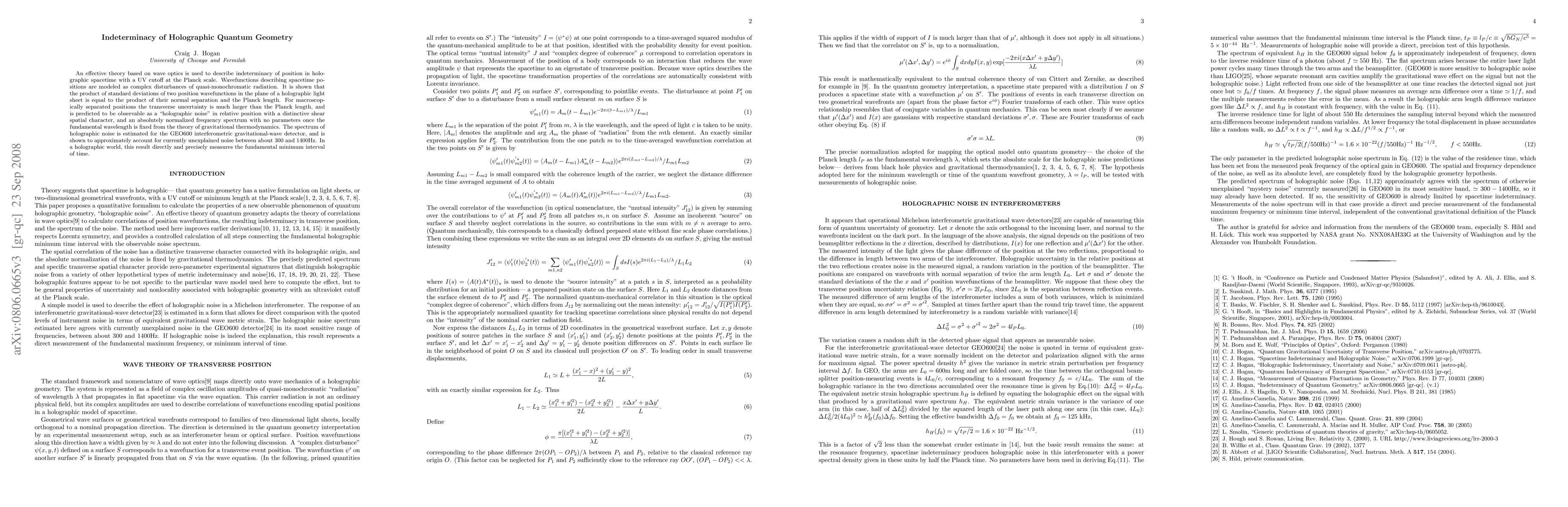 This paper explores the indeterminacy of position in holographic quantum geometry using wave optics, revealing a holographic noise observable as a "shear spatial character" with a normalized frequency spectrum. The study predicts this noise can account for unexplained interferometric gravitational-wave detector noise in the 300-1400Hz range, directly measuring the fundamental minimum interval of time.