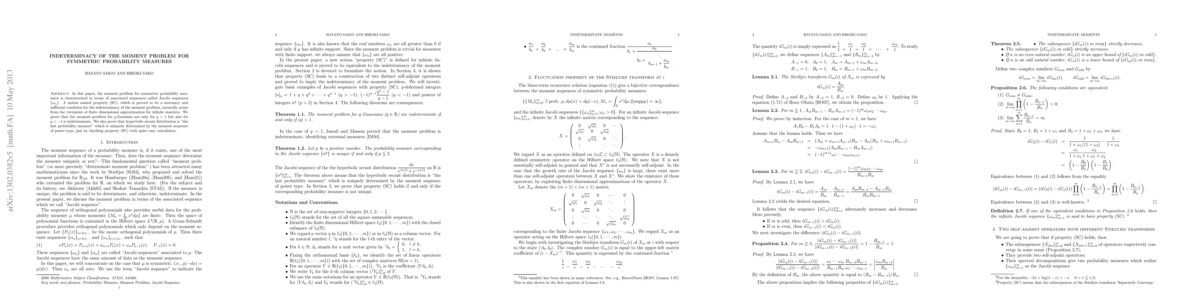 In this paper, the moment problem for symmetric probability measures is characterized in terms of associated sequences called Jacobi sequences $\{\omega_n\}$. A notion named property (SC), which is proved to be a necessary and sufficient condition for the indeterminacy of the moment problem, naturally arises from the viewpoint of finite dimensional approximation for infinite matrices. We prove that the moment problem for q-Gaussian not only for $q>1$ but also for $q<-1$ is indeterminate. We also prove that hyperbolic secant distribution is "the last probability measure" which is uniquely determined by the moment sequence of power type, just by checking property (SC) with quite easy calculation.