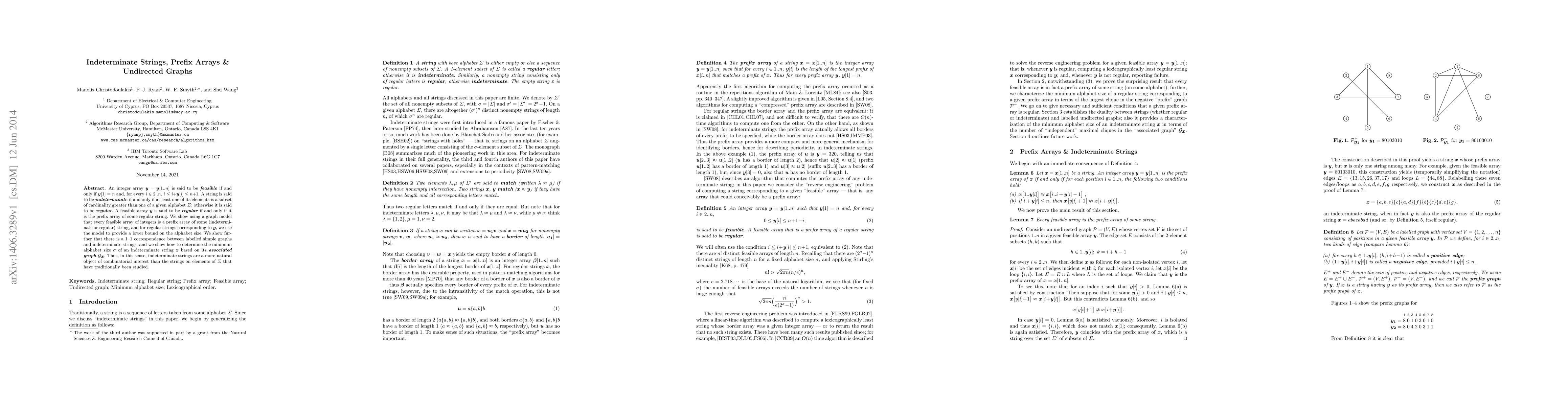 An integer array y = y[1..n] is said to be feasible if and only if y[1] = n and, for every i \in 2..n, i \le i+y[i] \le n+1. A string is said to be indeterminate if and only if at least one of its elements is a subset of cardinality greater than one of a given alphabet Sigma; otherwise it is said to be regular. A feasible array y is said to be regular if and only if it is the prefix array of some regular string. We show using a graph model that every feasible array of integers is a prefix array of some (indeterminate or regular) string, and for regular strings corresponding to y, we use the model to provide a lower bound on the alphabet size. We show further that there is a 1-1 correspondence between labelled simple graphs and indeterminate strings, and we show how to determine the minimum alphabet size |Sigma| of an indeterminate string x based on its associated graph Gx. Thus, in this sense, indeterminate strings are a more natural object of combinatorial interest than the strings on elements of Sigma that have traditionally been studied.