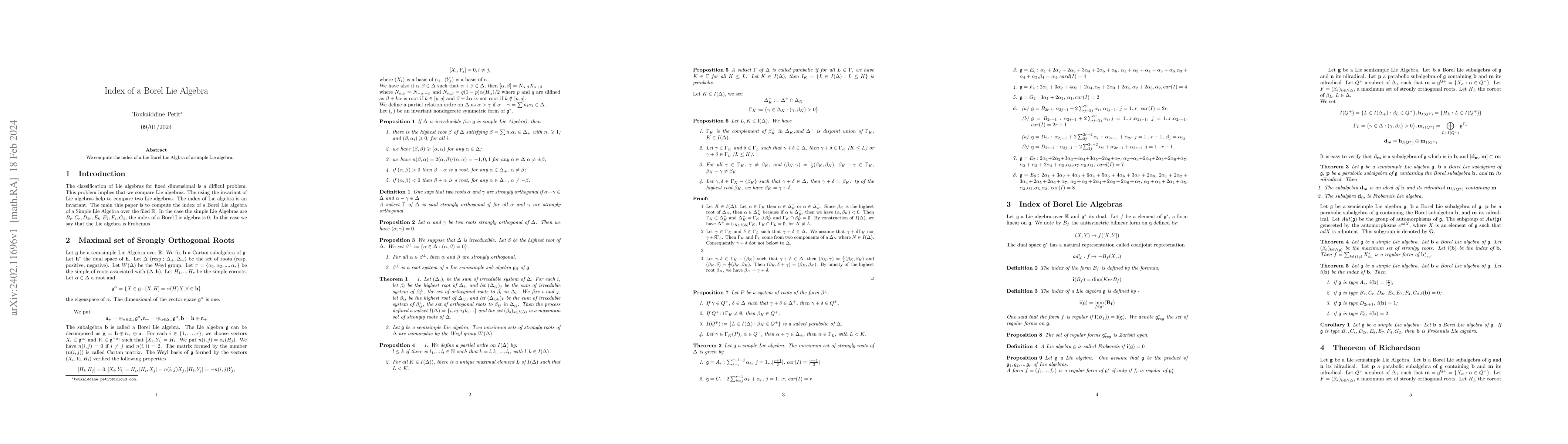 Summary: This paper calculates the index of a Lie Borel Lie algebra associated with a simple Lie algebra, providing insights into its structural properties. The findings contribute to the broader understanding of the algebraic topology of Lie algebras.