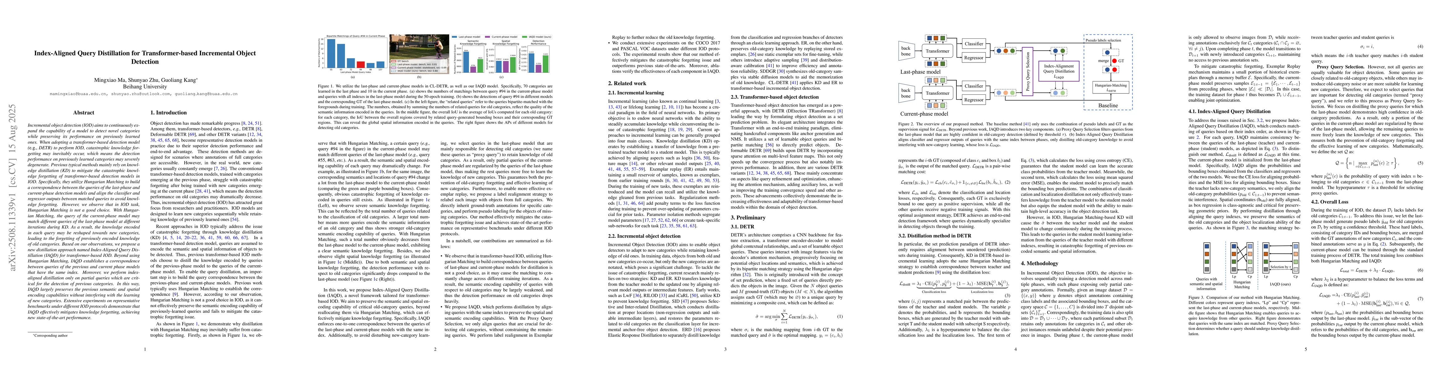 Incremental object detection (IOD) aims to continuously expand the capability of a model to detect novel categories while preserving its performance on previously learned ones. When adopting a transformer-based detection model to perform IOD, catastrophic knowledge forgetting may inevitably occur, meaning the detection performance on previously learned categories may severely degenerate. Previous typical methods mainly rely on knowledge distillation (KD) to mitigate the catastrophic knowledge forgetting of transformer-based detection models. Specifically, they utilize Hungarian Matching to build a correspondence between the queries of the last-phase and current-phase detection models and align the classifier and regressor outputs between matched queries to avoid knowledge forgetting. However, we observe that in IOD task, Hungarian Matching is not a good choice. With Hungarian Matching, the query of the current-phase model may match different queries of the last-phase model at different iterations during KD. As a result, the knowledge encoded in each query may be reshaped towards new categories, leading to the forgetting of previously encoded knowledge of old categories. Based on our observations, we propose a new distillation approach named Index-Aligned Query Distillation (IAQD) for transformer-based IOD. Beyond using Hungarian Matching, IAQD establishes a correspondence between queries of the previous and current phase models that have the same index. Moreover, we perform index-aligned distillation only on partial queries which are critical for the detection of previous categories. In this way, IAQD largely preserves the previous semantic and spatial encoding capabilities without interfering with the learning of new categories. Extensive experiments on representative benchmarks demonstrate that IAQD effectively mitigates knowledge forgetting, achieving new state-of-the-art performance.