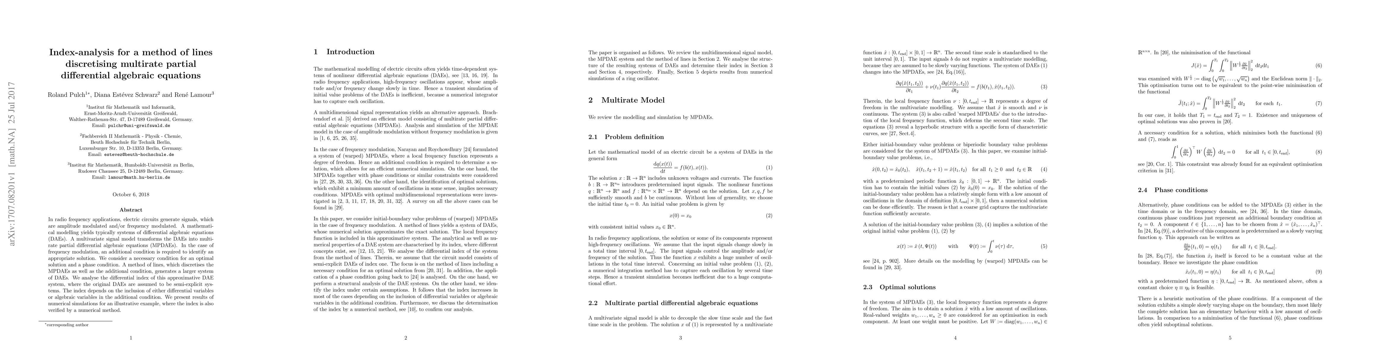 In radio frequency applications, electric circuits generate signals, which are amplitude modulated and/or frequency modulated. A mathematical modelling yields typically systems of differential algebraic equations (DAEs). A multivariate signal model transforms the DAEs into multirate partial differential algebraic equations (MPDAEs). In the case of frequency modulation, an additional condition is required to identify an appropriate solution. We consider a necessary condition for an optimal solution and a phase condition. A method of lines, which discretises the MPDAEs as well as the additional condition, generates a larger system of DAEs. We analyse the differential index of this approximative DAE system, where the original DAEs are assumed to be semi-explicit systems. The index depends on the inclusion of either differential variables or algebraic variables in the additional condition. We present results of numerical simulations for an illustrative example, where the index is also verified by a numerical method.