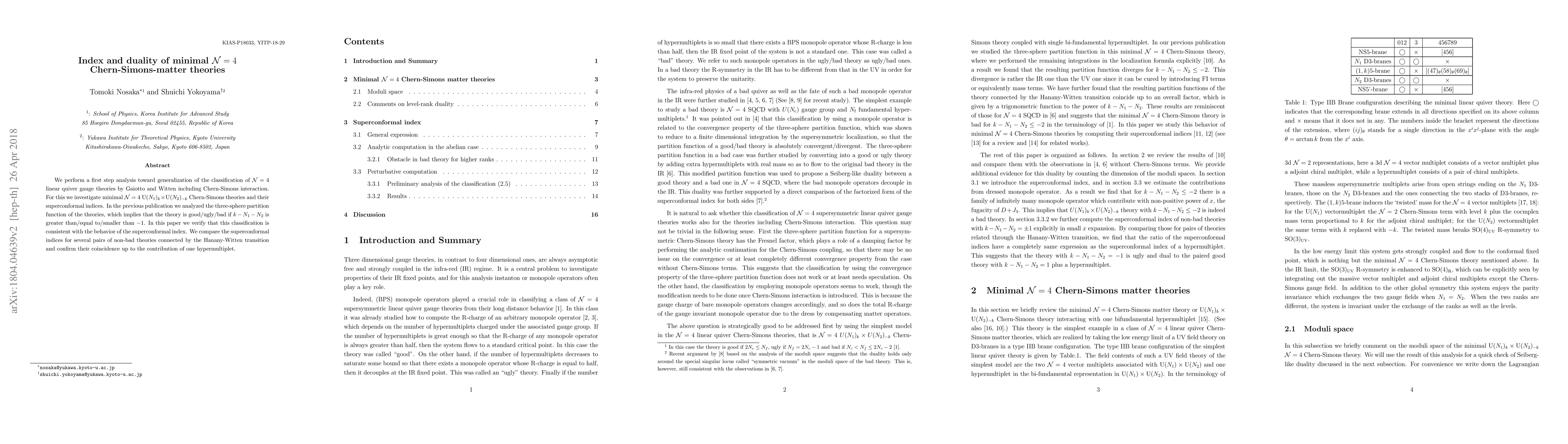 This paper investigates minimal N=4 Chern-Simons-matter theories with U(N_1)_k x U(N_2)_{-k} gauge groups, confirming the classification based on superconformal indices. It verifies the consistency of the theory's good/ugly/bad behavior with the superconformal index and demonstrates the coincidence of indices for non-bad theories connected by Hanany-Witten transitions.