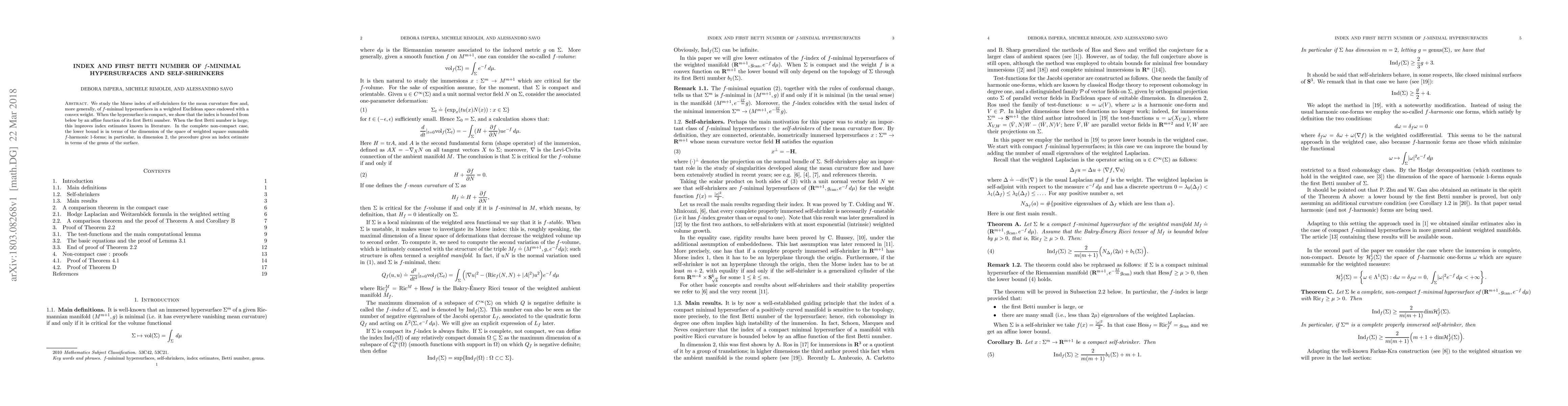 We study the Morse index of self-shrinkers for the mean curvature flow and, more generally, of $f$-minimal hypersurfaces in a weighted Euclidean space endowed with a convex weight. When the hypersurface is compact, we show that the index is bounded from below by an affine function of its first Betti number. When the first Betti number is large, this improves index estimates known in literature. In the complete non-compact case, the lower bound is in terms of the dimension of the space of weighted square summable $f$-harmonic $1$-forms; in particular, in dimension $2$, the procedure gives an index estimate in terms of the genus of the surface.