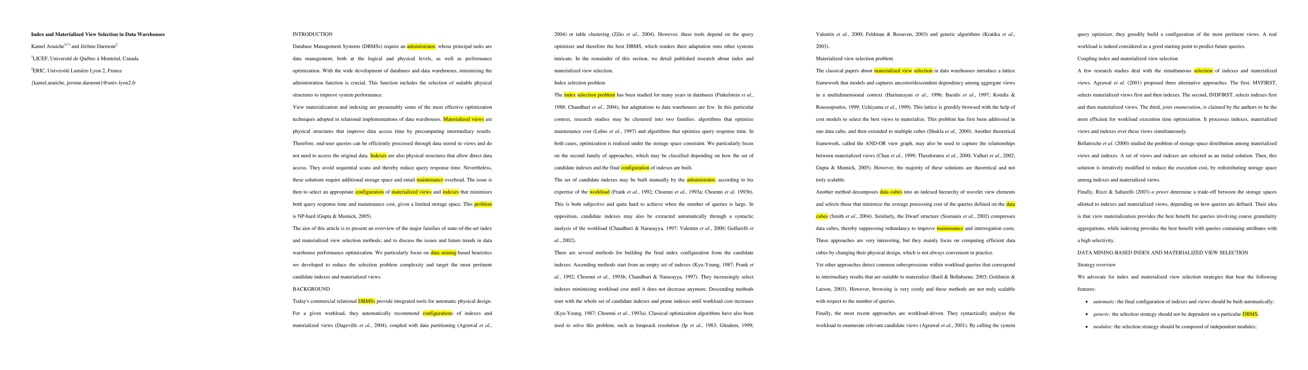 Summary: This paper reviews advanced index and materialized view selection methods for data warehouse performance optimization, emphasizing new data mining-based heuristics to simplify selection and identify the most effective candidates. It also explores future trends in this area.