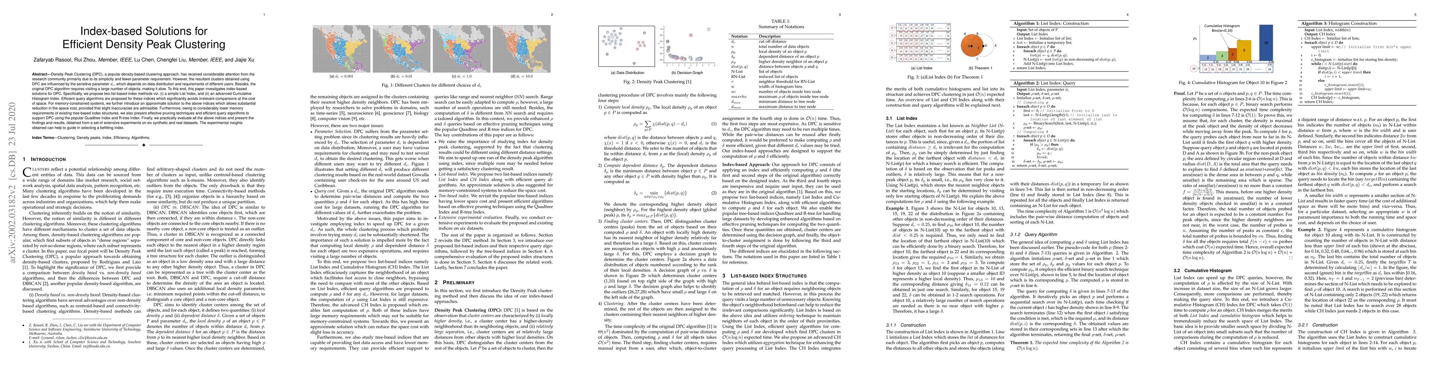 This paper proposes index-based solutions to enhance the efficiency of Density Peak Clustering (DPC) by introducing list-based indices and tree-based structures like Quadtree and R-tree, along with pruning techniques to reduce memory usage. Experimental results on synthetic and real datasets demonstrate significant improvements in speed and efficiency.