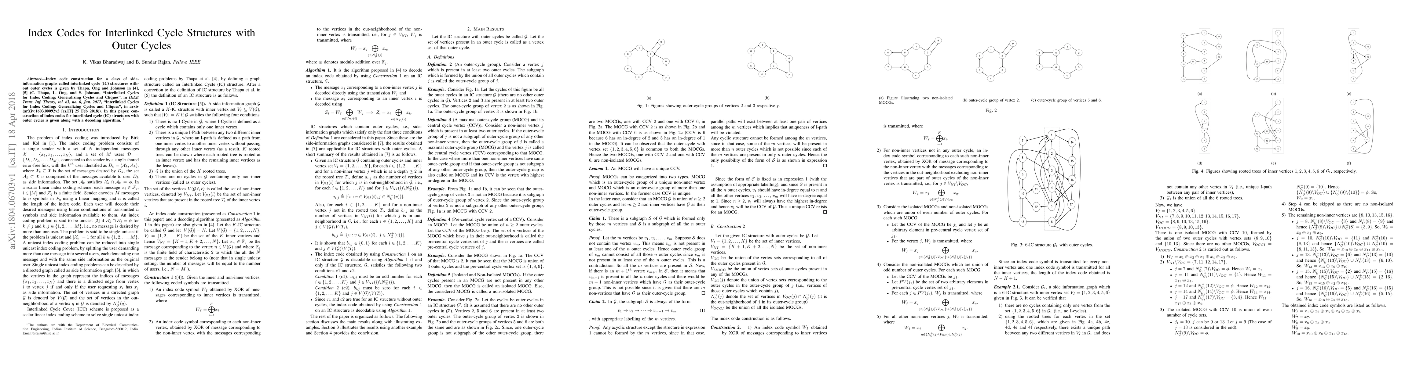 This paper extends index code constructions for interlinked cycle structures to include outer cycles, providing a new decoding algorithm to handle these complex side-information graphs. The work builds on prior research by Thapa, Ong, and Johnson for IC structures without outer cycles.