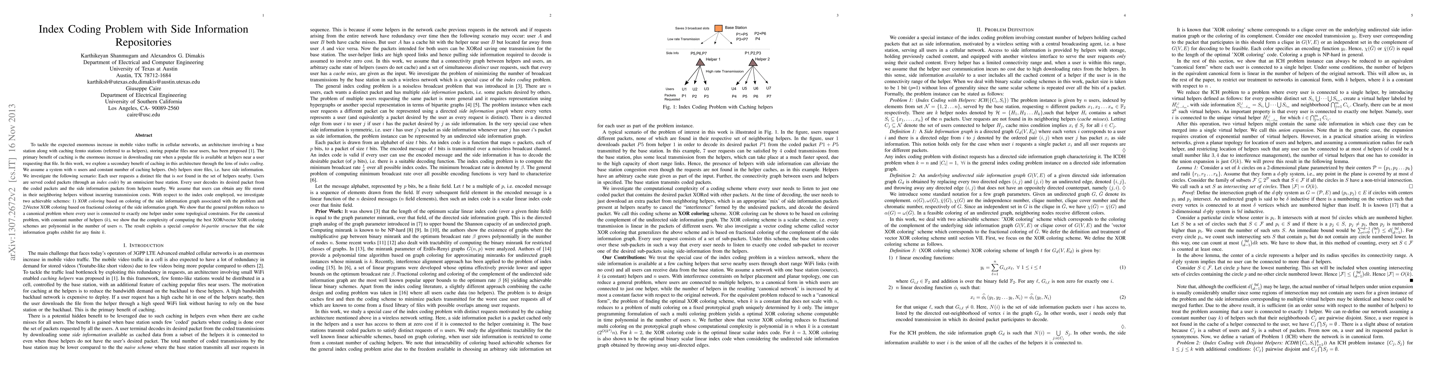 To tackle the expected enormous increase in mobile video traffic in cellular networks, an architecture involving a base station along with caching femto stations (referred to as helpers), storing popular files near users, has been proposed [1]. The primary benefit of caching is the enormous increase in downloading rate when a popular file is available at helpers near a user requesting that file. In this work, we explore a secondary benefit of caching in this architecture through the lens of index coding. We assume a system with n users and constant number of caching helpers. Only helpers store files, i.e. have side information. We investigate the following scenario: Each user requests a distinct file that is not found in the set of helpers nearby. Users are served coded packets (through an index code) by an omniscient base station. Every user decodes its desired packet from the coded packets and the side information packets from helpers nearby. We assume that users can obtain any file stored in their neighboring helpers without incurring transmission costs. With respect to the index code employed, we investigate two achievable schemes: 1) XOR coloring based on coloring of the side information graph associated with the problem and 2)Vector XOR coloring based on fractional coloring of the side information graph. We show that the general problem reduces to a canonical problem where every user is connected to exactly one helper under some topological constraints. For the canonical problem, with constant number of helpers (k), we show that the complexity of computing the best XOR/vector XOR coloring schemes are polynomial in the number of users n. The result exploits a special complete bi-partite structure that the side information graphs exhibit for any finite k.