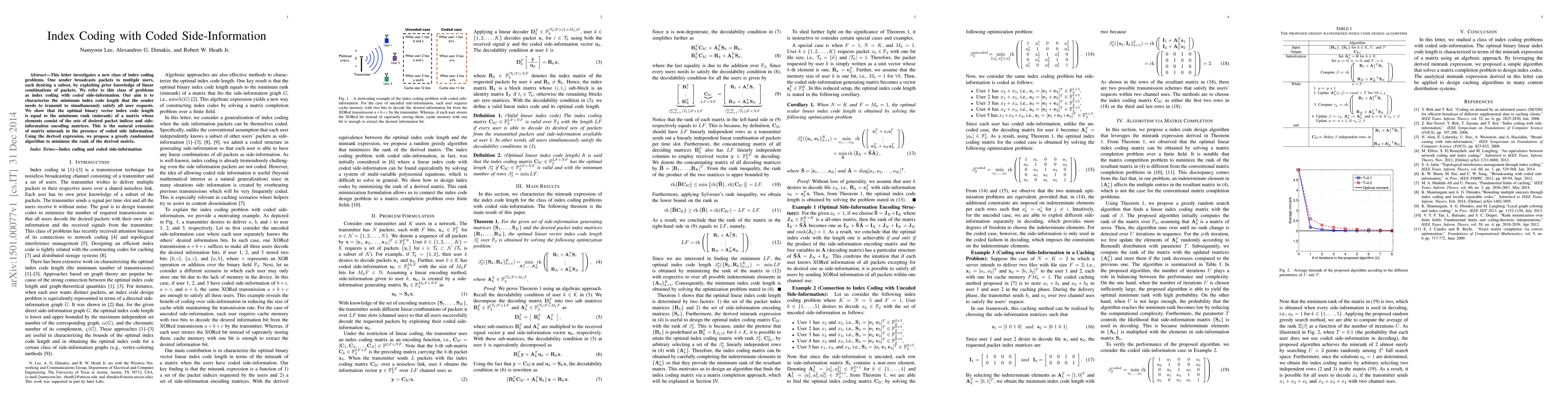 This paper explores index coding problems where a sender broadcasts packets to multiple users using linear combinations of packets, termed index coding with coded side-information. The study aims to determine the minimum index code length required for the sender to satisfy all user requests, showing that it equals the minimum rank of a matrix involving desired packet indices and encoding matrices. A greedy randomized algorithm is proposed to minimize this rank.