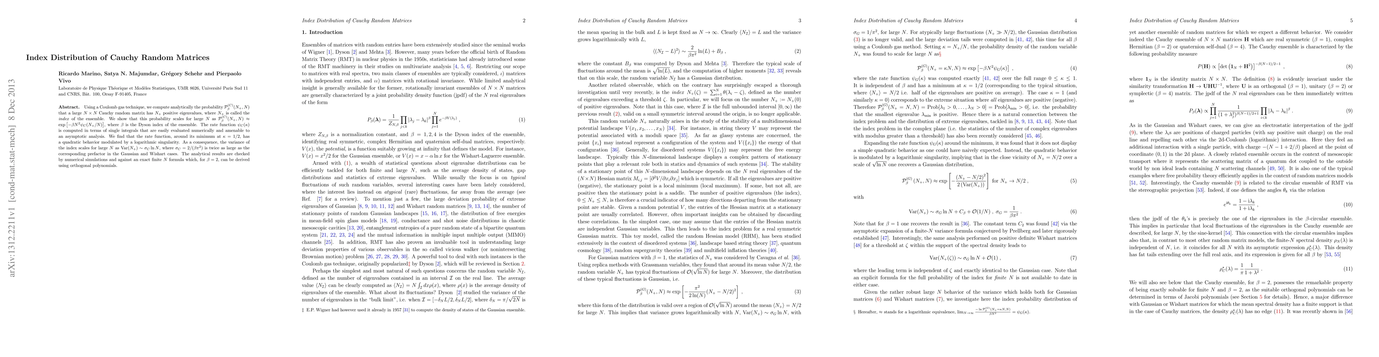 Using a Coulomb gas technique, we compute analytically the probability $\mathcal{P}_\beta^{(C)}(N_+,N)$ that a large $N\times N$ Cauchy random matrix has $N_+$ positive eigenvalues, where $N_+$ is called the index of the ensemble. We show that this probability scales for large $N$ as $\mathcal{P}_\beta^{(C)}(N_+,N)\approx \exp\left[-\beta N^2 \psi_C(N_+/N)\right]$, where $\beta$ is the Dyson index of the ensemble. The rate function $\psi_C(\kappa)$ is computed in terms of single integrals that are easily evaluated numerically and amenable to an asymptotic analysis. We find that the rate function, around its minimum at $\kappa=1/2$, has a quadratic behavior modulated by a logarithmic singularity. As a consequence, the variance of the index scales for large $N$ as $\mathrm{Var}(N_+)\sim \sigma_C\ln N$, where $\sigma_C=2/(\beta\pi^2)$ is twice as large as the corresponding prefactor in the Gaussian and Wishart cases. The analytical results are checked by numerical simulations and against an exact finite $N$ formula which, for $\beta=2$, can be derived using orthogonal polynomials.