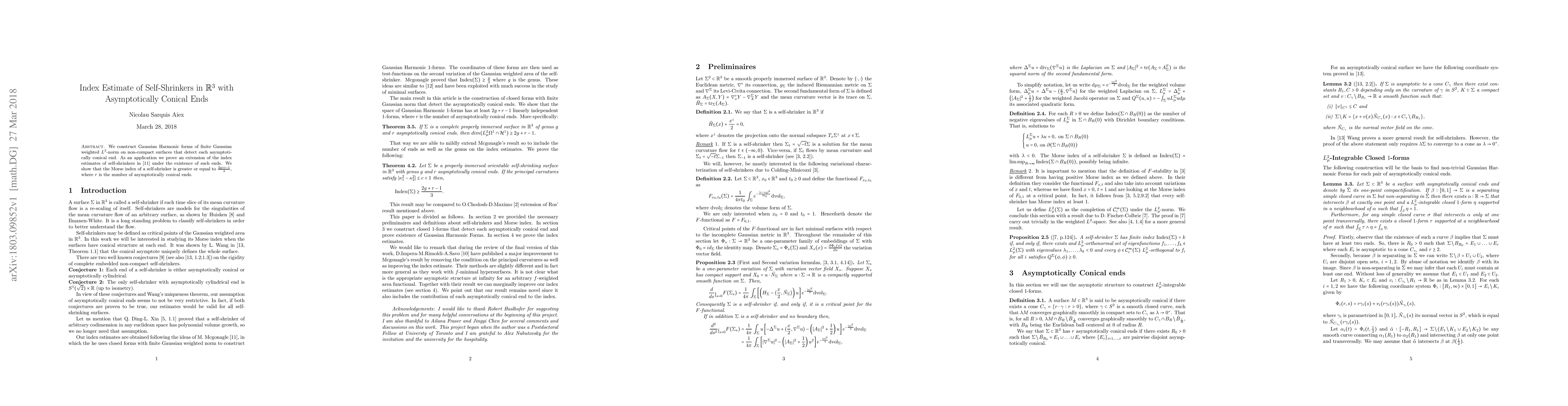 This research constructs specific Gaussian Harmonic forms to identify each asymptotically conical end on non-compact surfaces. It extends index estimates for self-shrinkers in 3D spaces, proving that the Morse index is at least (2g+r-1)/3, where r denotes the number of such ends.