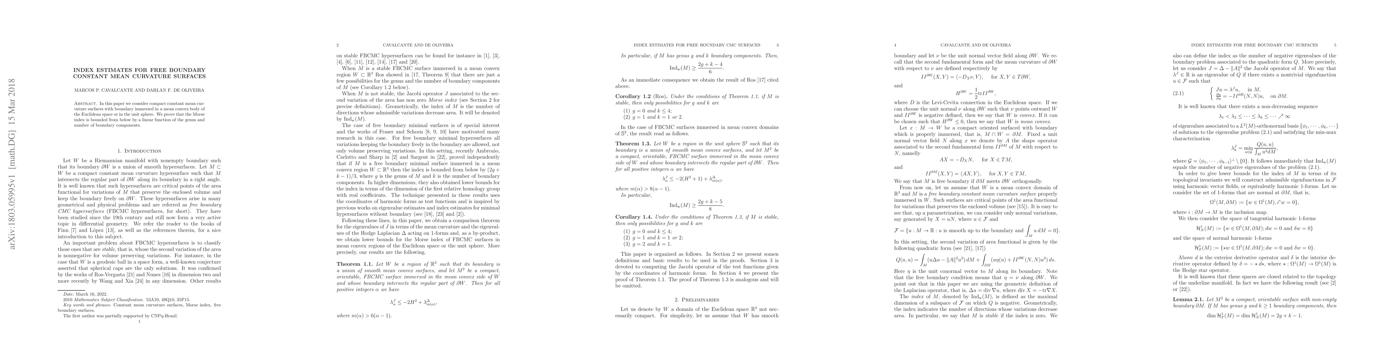 This paper proves that the Morse index of compact free boundary constant mean curvature surfaces is bounded below by a linear function of their genus and the number of boundary components, regardless of whether they are immersed in a mean convex body in Euclidean space or in the unit sphere.