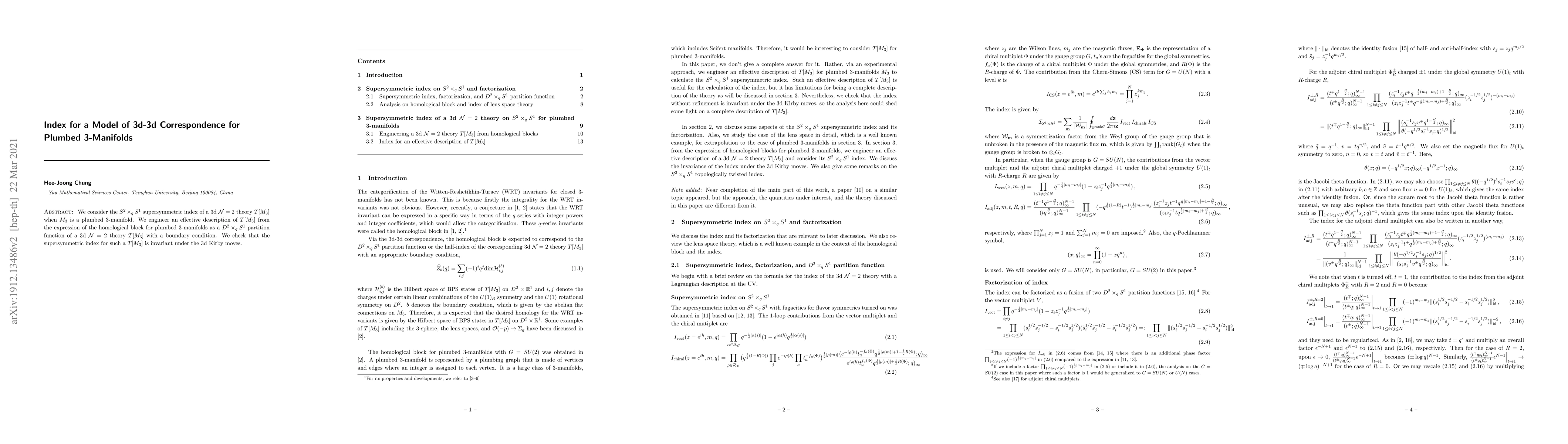 We consider the $S^2 \times_q S^1$ supersymmetric index of a 3d $\mathcal{N}=2$ theory $T[M_3]$ when $M_3$ is a plumbed 3-manifold. We engineer an effective description of $T[M_3]$ from the expression of the homological block for plumbed 3-manifolds as a $D^2 \times_q S^1$ partition function of a 3d $\mathcal{N}=2$ theory $T[M_3]$ with a boundary condition. We check that the supersymmetric index for such a $T[M_3]$ is invariant under the 3d Kirby moves.