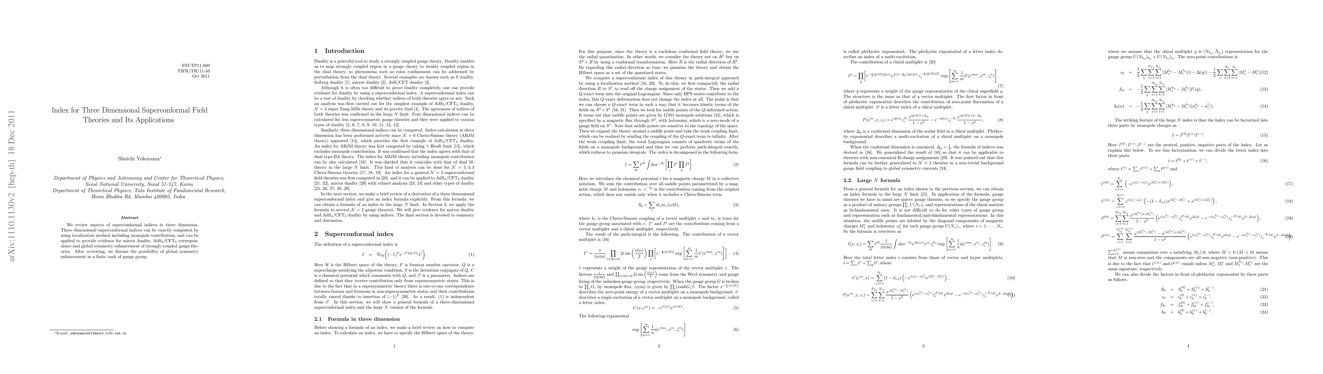 We review aspects of superconformal indices in three dimension. Three dimensional superconformal indices can be exactly computed by using localization method including monopole contribution, and can be applied to provide evidences for mirror duality, AdS_4/CFT_3 correspondence and global symmetry enhancement of strongly coupled gauge theories. After reviewing, we discuss the possibility of global symmetry enhancement in a finite rank of gauge group.