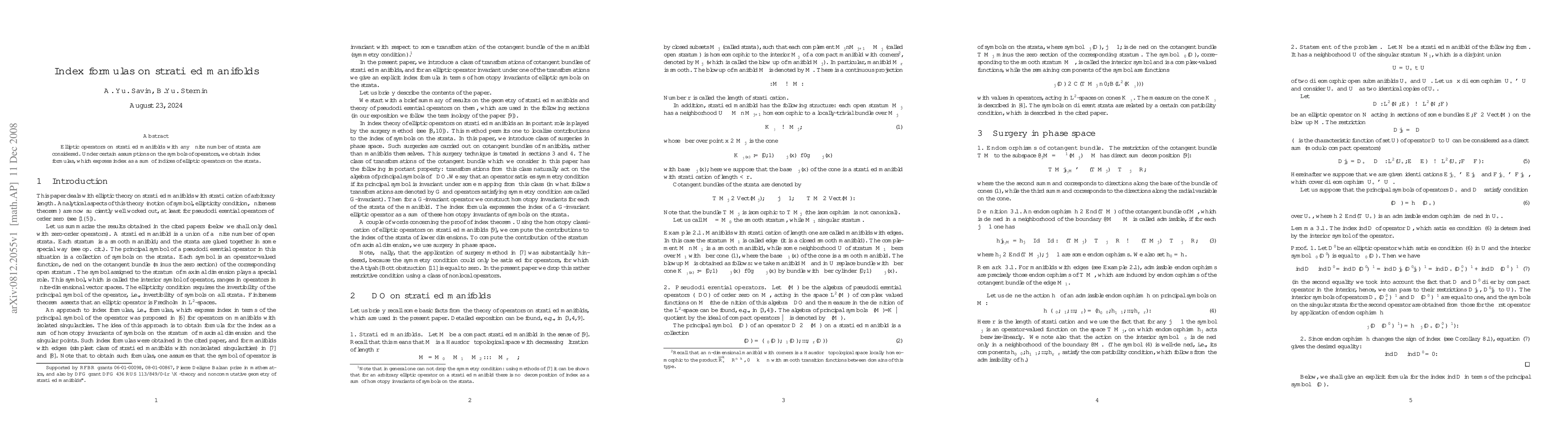 Summary: This paper develops index formulas for elliptic operators on stratified manifolds, showing that the index can be expressed as a sum of indices from each of the manifold's strata under specific operator symbol conditions.
