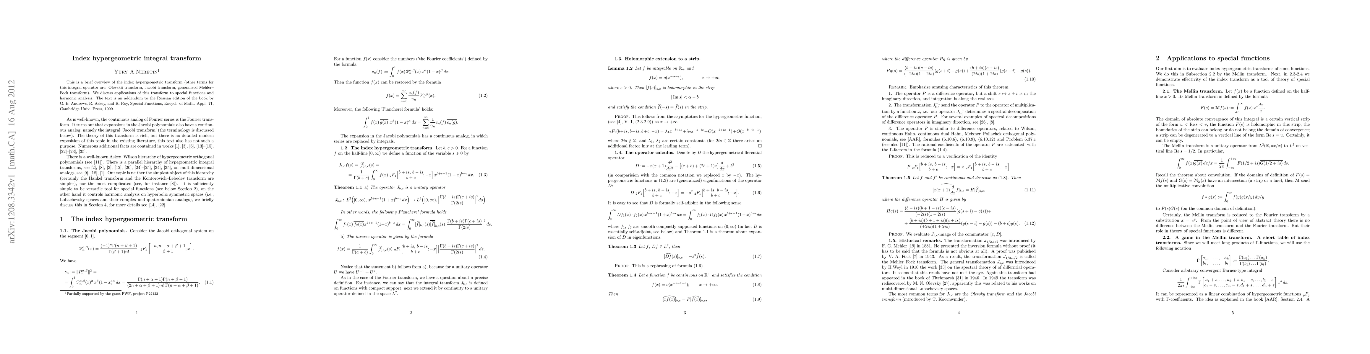 This is a brief overview of the index hypergeometric transform (other terms for this integral operator are: Olevskii transform, Jacobi transform, generalized Mehler--Fock transform). We discuss applications of this transform to special functions and harmonic analysis. The text is an addendum to the Russian edition of the book by G.E.Andrews, R.Askey, and R.Roy, Special Functions, Encycl. of Math. Appl. 71, Cambridge Univ. Press, 1999.