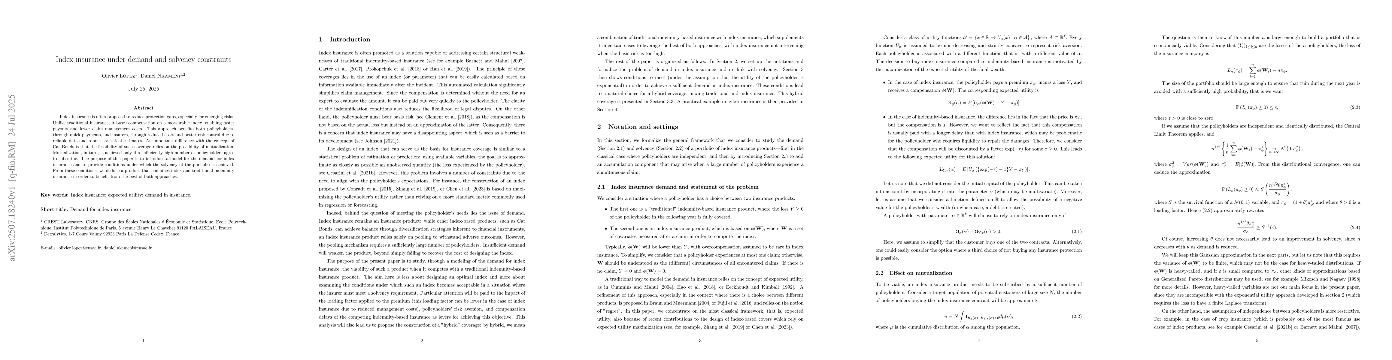 Index insurance is often proposed to reduce protection gaps, especially for emerging risks. Unlike traditional insurance, it bases compensation on a measurable index, enabling faster payouts and lower claim management costs. This approach benefits both policyholders, through quick payments, and insurers, through reduced costs and better risk control due to reliable data and robust statistical estimates. An important difference with the concept of Cat Bonds is that the feasibility of such coverage relies on the possibility of mutualization. Mutualization, in turn, is achieved only if a sufficiently high number of policyholders agree to subscribe. The purpose of this paper is to introduce a model for the demand for index insurance and to provide conditions under which the solvency of the portfolio is achieved. From these conditions, we deduce a product that combines index and traditional indemnity insurance in order to benefit from the best of both approaches.