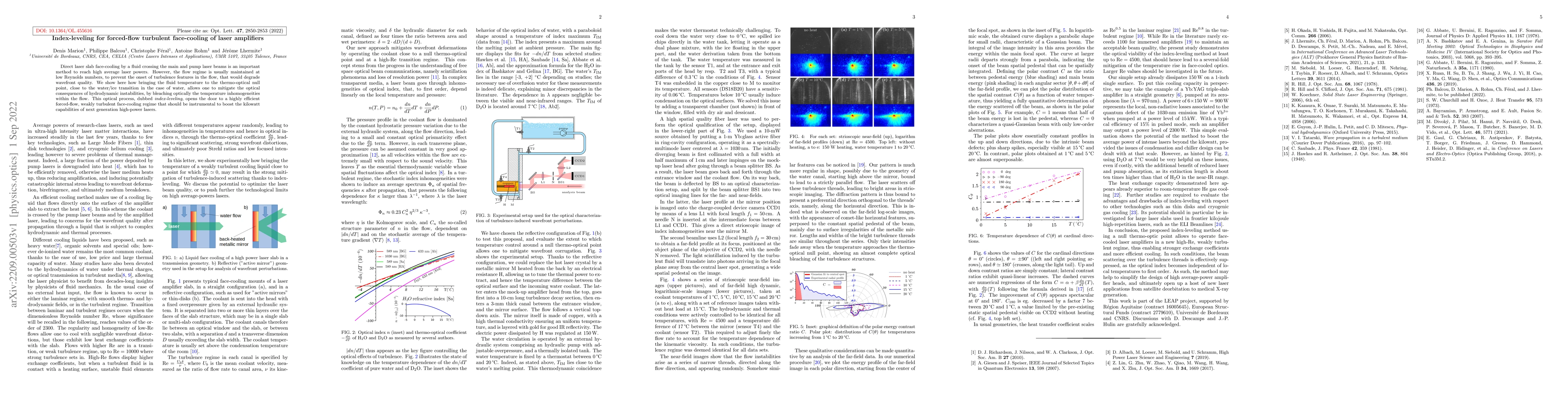 Direct laser slab face-cooling by a fluid crossing the main and pump laser beams is an important method to reach high average laser powers. However, the flow regime is usually maintained at low Reynolds numbers, to prevent the onset of turbulence features in the flow, that would degrade wavefront quality. We show here how bringing the fluid temperature to the thermo-optical null point, close to the water/ice transition in the case of water, allows one to mitigate the optical consequences of hydrodynamic instabilities, by bleaching optically the temperature inhomogeneities within the flow. This optical process, dubbed 'index-leveling', opens the door to a highly efficient forced-flow, weakly turbulent face-cooling regime that should be instrumental to boost the kilowatt capabilities of next generation high-power lasers.