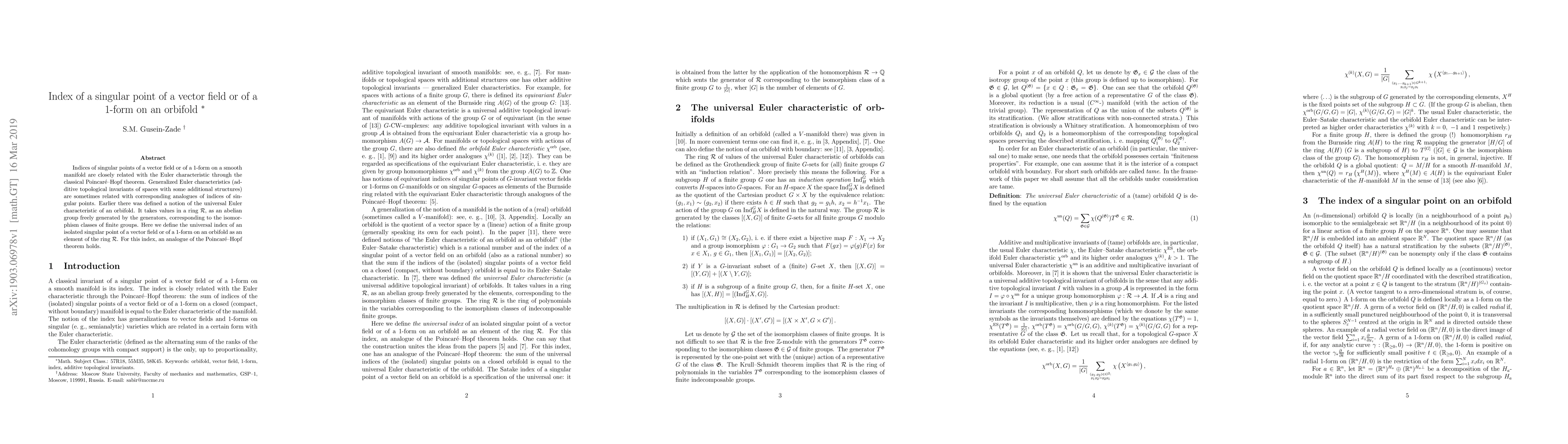 This paper defines the universal index of isolated singular points of vector fields or 1-forms on orbifolds, extending the classical Poincaré-Hopf theorem to this generalized context, using a ring R to encapsulate the universal Euler characteristic of the orbifold.