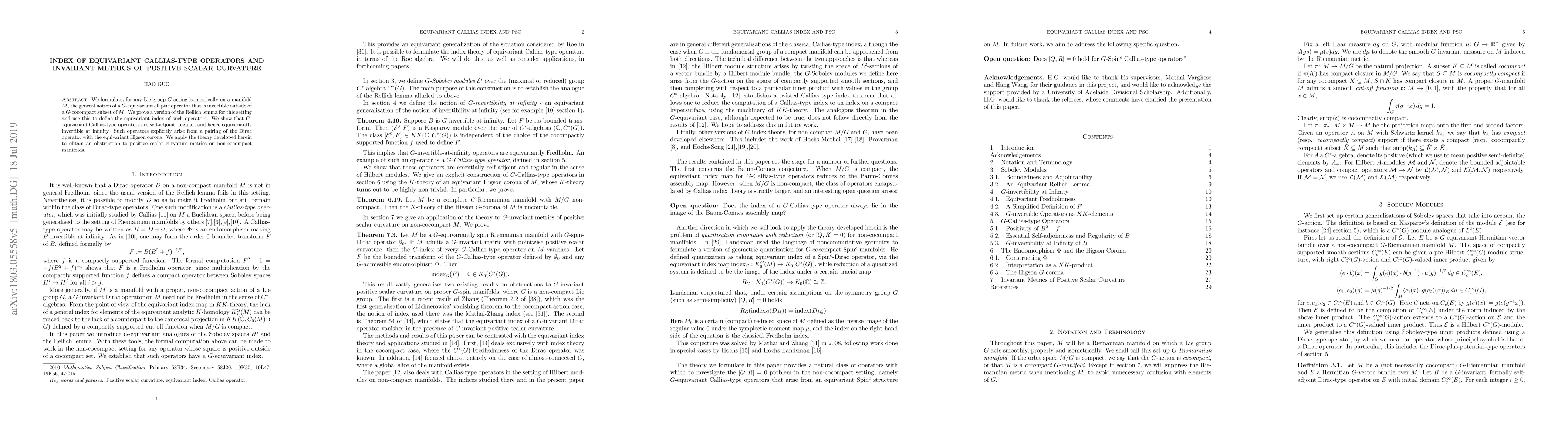 We formulate, for any Lie group G acting isometrically on a manifold M, the general notion of a G-equivariant elliptic operator that is invertible outside of a G-cocompact subset of M. We prove a version of the Rellich lemma for this setting and use this to define the equivariant index of such operators. We show that G-equivariant Callias-type operators are self-adjoint, regular, and hence equivariantly invertible at infinity. Such operators explicitly arise from a pairing of the Dirac operator with the equivariant Higson corona. We apply the theory developed herein to obtain an obstruction to positive scalar curvature metrics on non-cocompact manifolds.