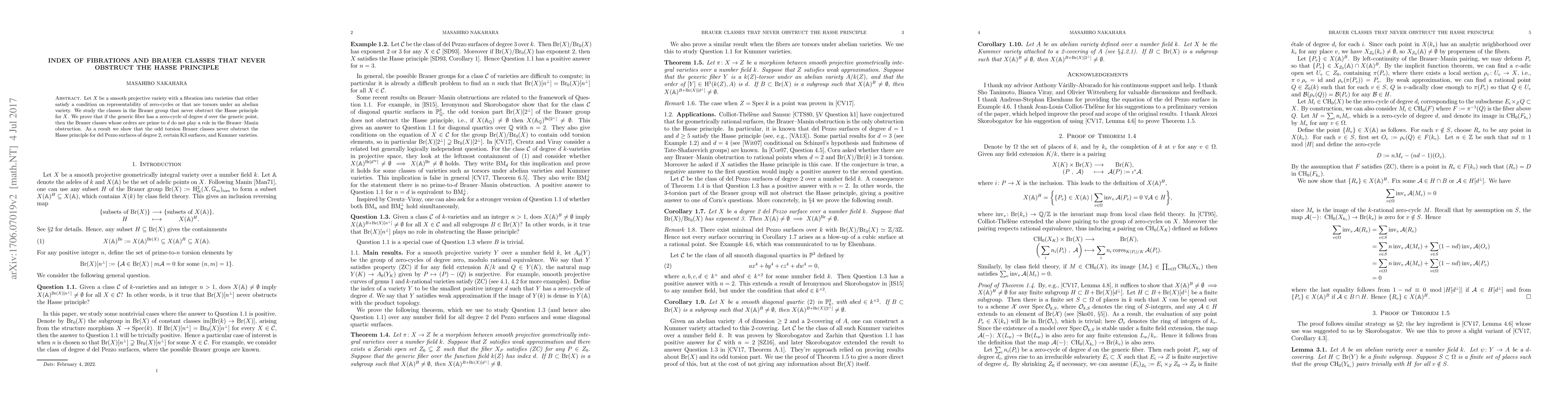 This paper investigates Brauer classes in fibrations of smooth projective varieties that either satisfy zero-cycle representability conditions or are torsors under abelian varieties. It proves that Brauer classes whose orders are prime to the degree of a generic fiber's zero-cycle do not obstruct the Hasse principle, showing that odd torsion Brauer classes never obstruct the Hasse principle for specific varieties like del Pezzo surfaces of degree 2, certain K3 surfaces, and Kummer varieties.