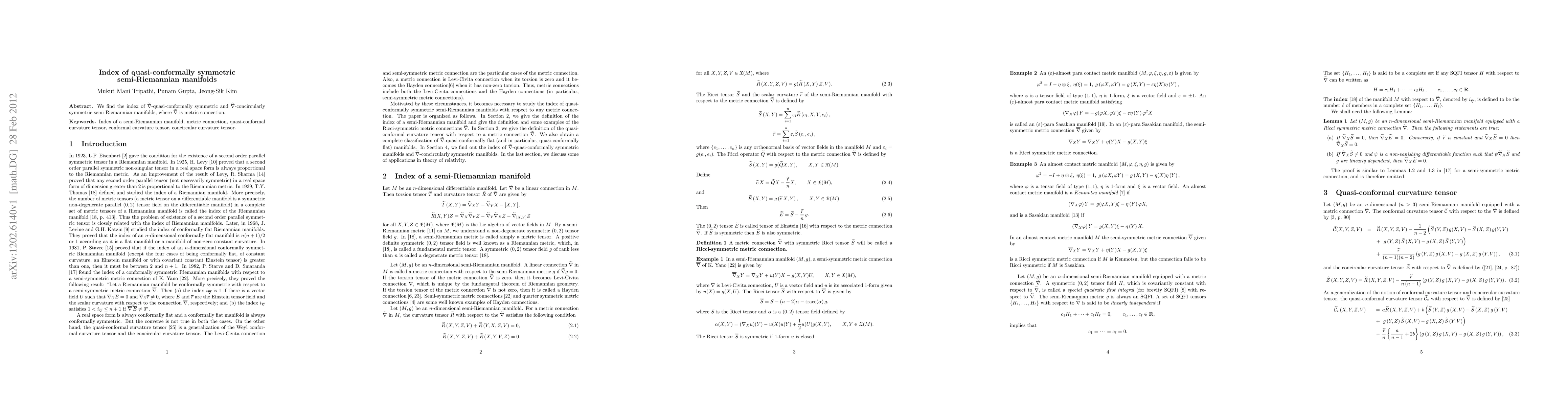 Summary: This paper investigates the index of quasi-conformally symmetric and concircularly symmetric semi-Riemannian manifolds using the metric connection $\widetilde{\nabla}$. The study aims to understand the geometric properties associated with these specific types of manifold symmetries.