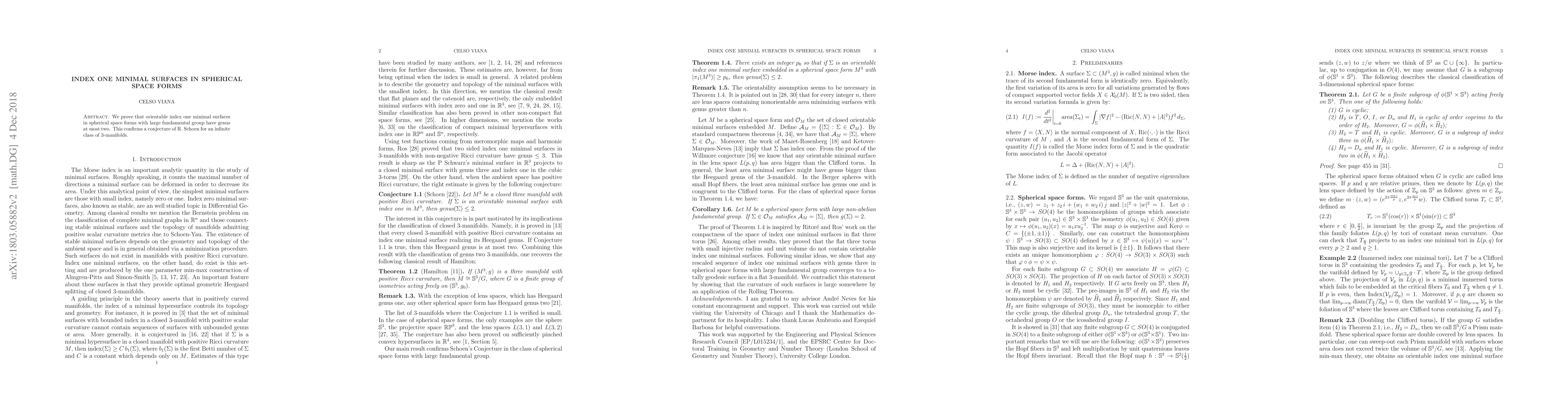 Summary: The paper proves that orientable index one minimal surfaces in spherical space forms with large fundamental groups have genus at most two, confirming a conjecture by R. Schoen for an infinite class of 3-manifolds. This result provides significant insight into the topology of minimal surfaces in these geometric spaces.