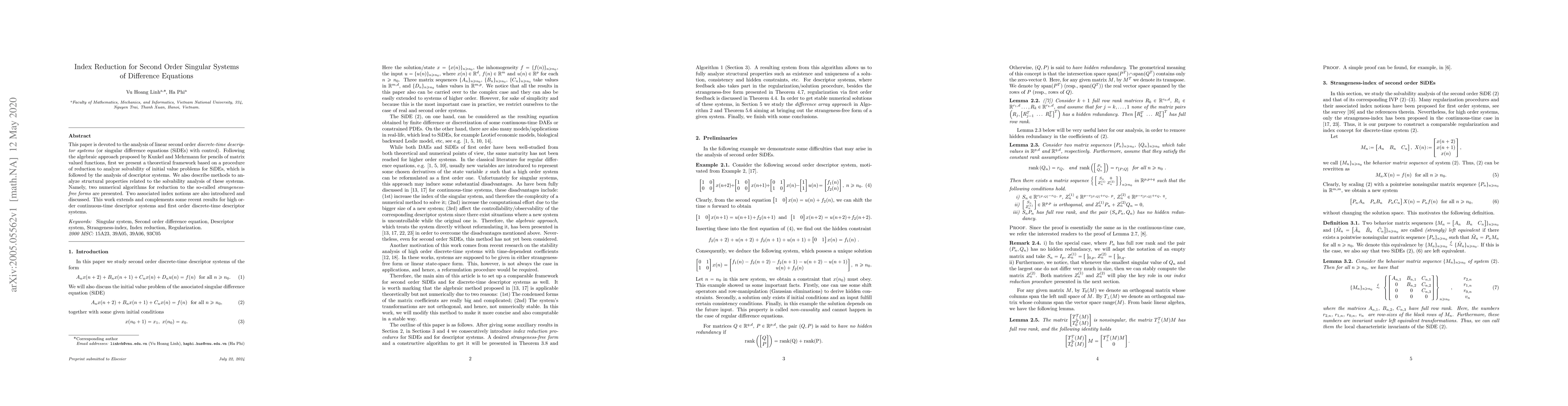 This paper is devoted to the analysis of linear second order discrete-time descriptor systems (or singular difference equations (SiDEs) with control). Following the algebraic approach proposed by Kunkel and Mehrmann for pencils of matrix valued functions, first we present a theoretical framework based on a procedure of reduction to analyze solvability of initial value problems for SiDEs, which is followed by the analysis of descriptor systems. We also describe methods to analyze structural properties related to the solvability analysis of these systems. Namely, two numerical algorithms for reduction to the so-called strangenessfree forms are presented. Two associated index notions are also introduced and discussed. This work extends and complements some recent results for high order continuous-time descriptor systems and first order discrete-time descriptor systems.