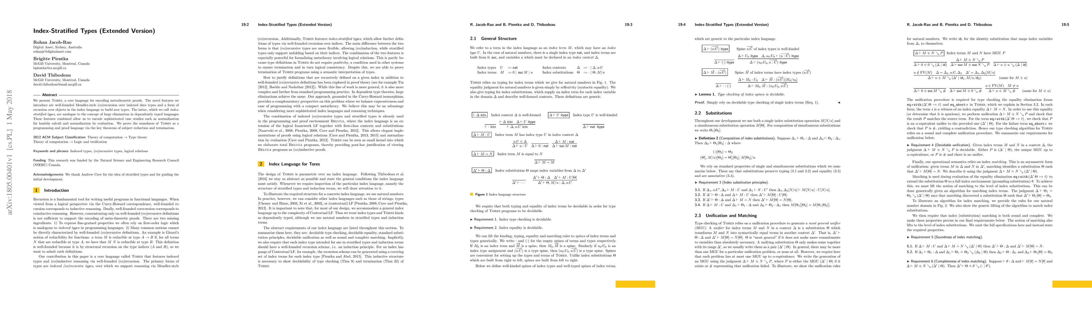 We present Tores, a core language for encoding metatheoretic proofs. The novel features we introduce are well-founded Mendler-style (co)recursion over indexed data types and a form of recursion over objects in the index language to build new types. The latter, which we call index-stratified types, are analogue to the concept of large elimination in dependently typed languages. These features combined allow us to encode sophisticated case studies such as normalization for lambda calculi and normalization by evaluation. We prove the soundness of Tores as a programming and proof language via the key theorems of subject reduction and termination.