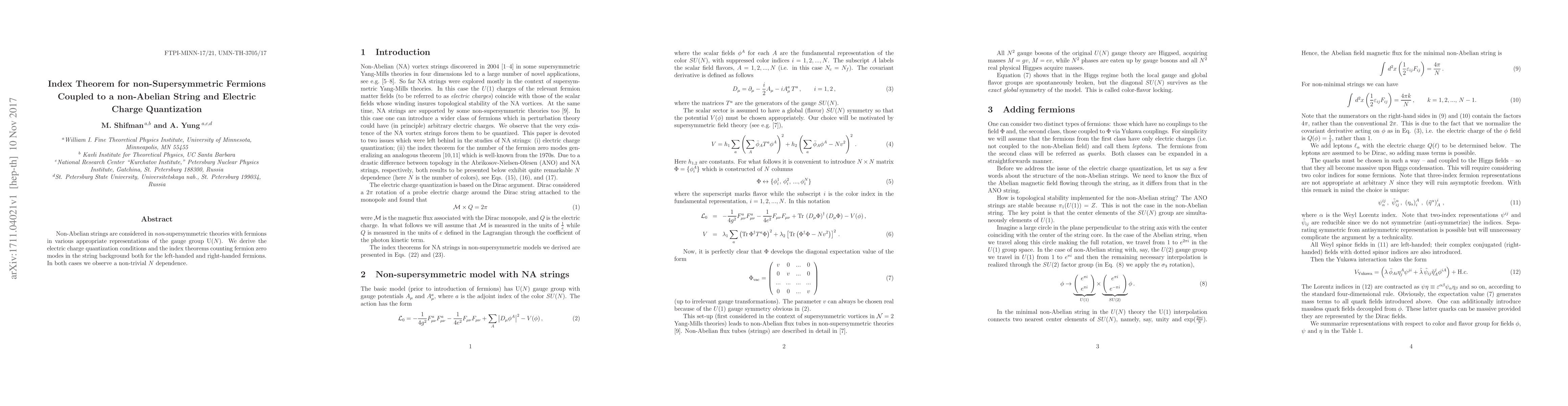 Summary: This paper derives electric charge quantization conditions and index theorems for non-supersymmetric fermions coupled to non-Abelian strings, revealing a non-trivial dependence on the number of representations in the gauge group U($N$). The study focuses on both left-handed and right-handed fermion zero modes in the string background.