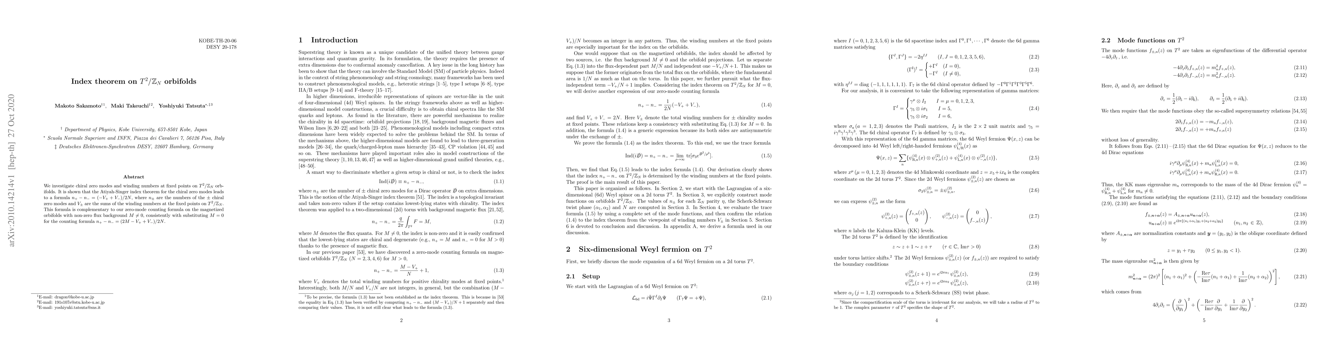 Summary: The research examines chiral zero modes and their winding numbers on $T^2/\mathbb{Z}_N$ orbifolds, deriving an index theorem formula relating chiral zero modes to winding numbers. The formula $n_+ - n_- = (-V_+ + V_-)/2N$ is shown to be consistent with zero-mode counting on magnetized orbifolds when flux is zero.
