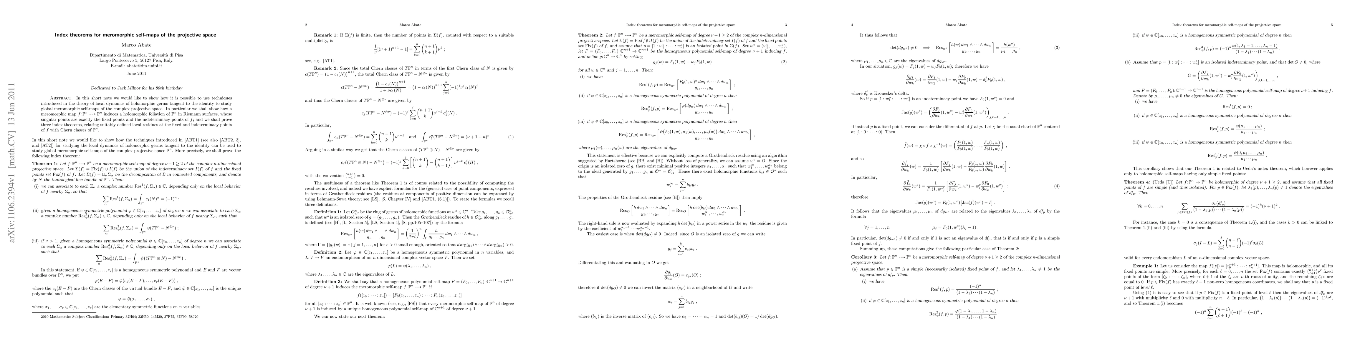 This paper explores the application of local dynamics techniques to global meromorphic self-maps of complex projective space, demonstrating how such maps induce holomorphic foliations and proving three index theorems linking local residues at singular points with the Chern classes of the space.