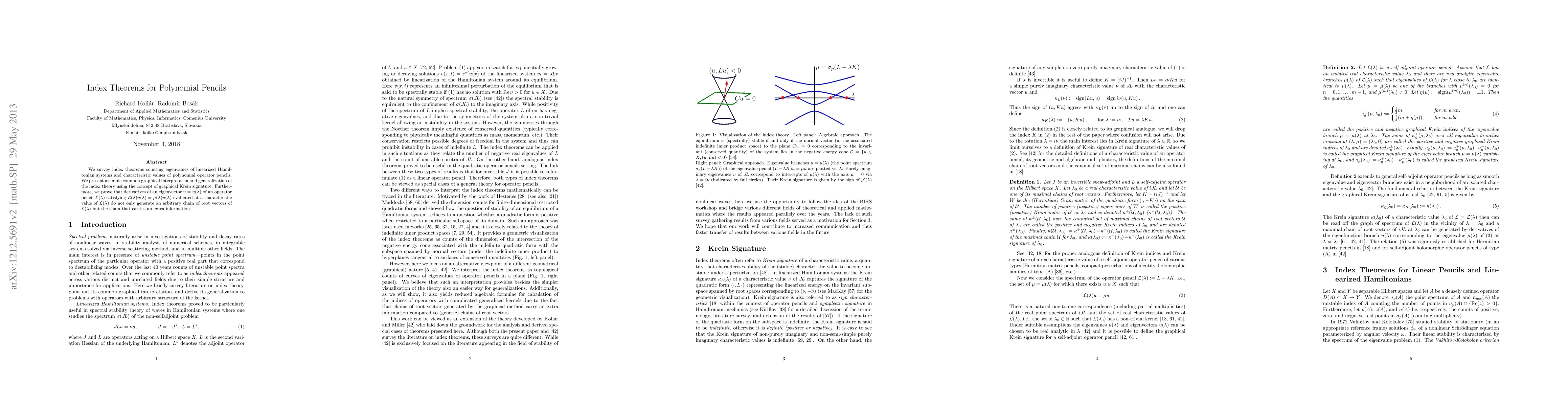 We survey index theorems counting eigenvalues of linearized Hamiltonian systems and characteristic values of polynomial operator pencils. We present a simple common graphical interpretation and generalization of the index theory using the concept of graphical Krein signature. Furthermore, we prove that derivatives of an eigenvector u= u(\lambda) of an operator pencil L(\lambda) satisfying L(\lambda) u(\lambda)= \mu(\lambda) u(\lambda) evaluated at a characteristic value of L(\lambda) do not only generate an arbitrary chain of root vectors of L(\lambda) but the chain that carries an extra information.