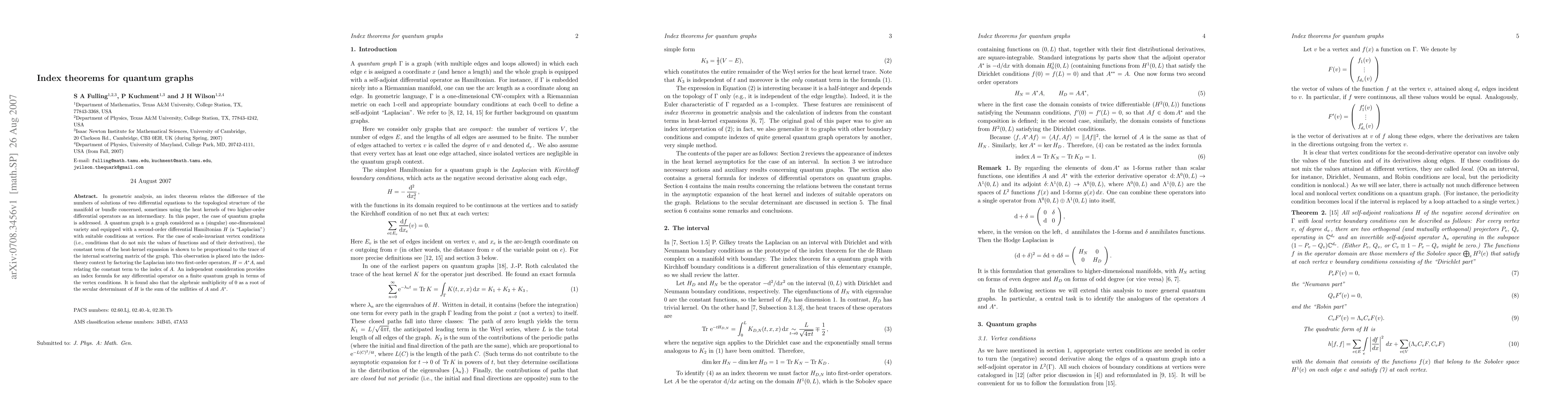 This paper explores index theorems for quantum graphs, establishing a link between heat-kernel constants and scattering matrices. It introduces an index formula for differential operators on finite quantum graphs based on vertex conditions, revealing that the algebraic multiplicity of 0 as a root of the secular determinant equals the sum of nullities of A and A*.