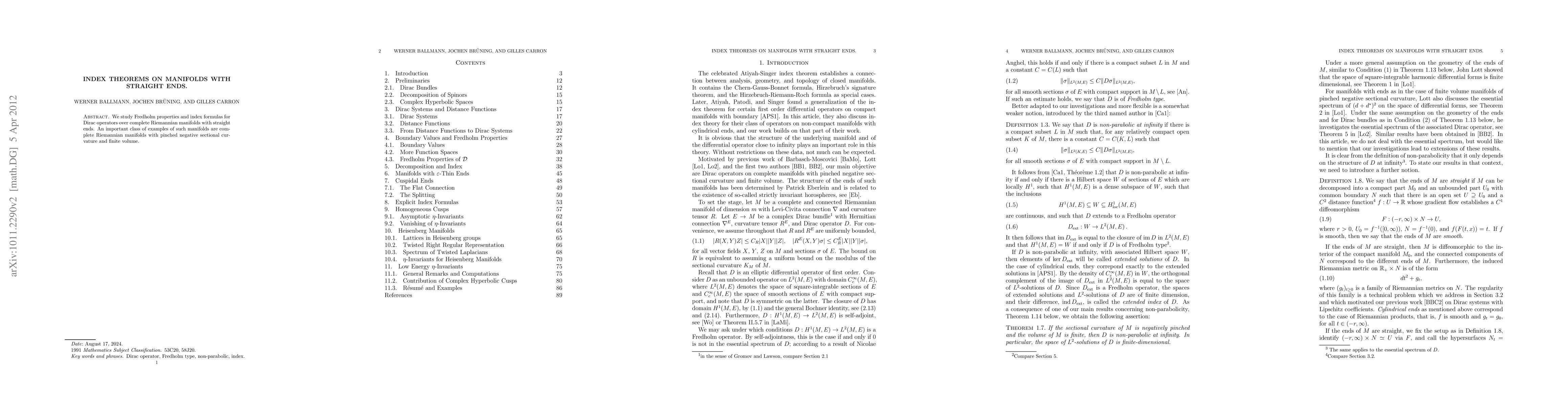 This paper explores the Fredholm properties and index theorems for Dirac operators on complete Riemannian manifolds characterized by straight ends, with a focus on examples from manifolds with pinched negative curvature and finite volume.
