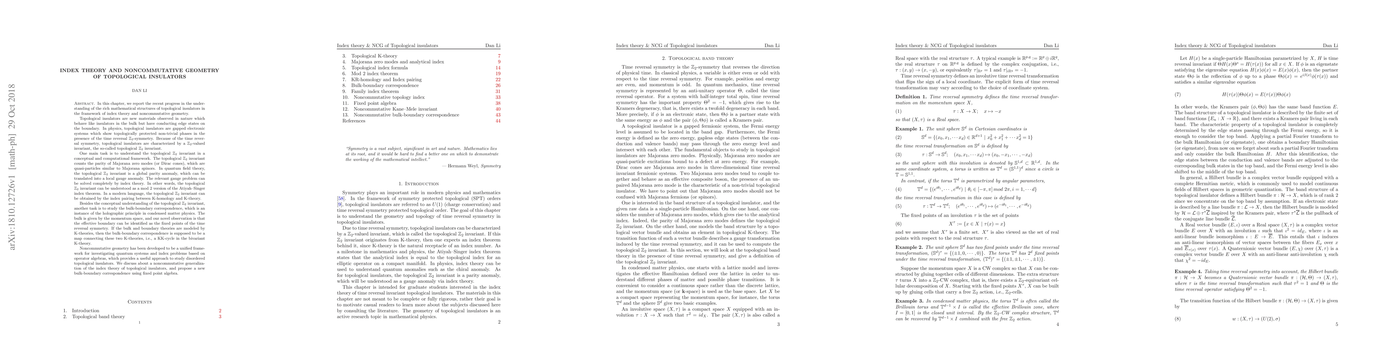 In this chapter, we report the recent progress in the understanding of the rich mathematical structures of topological insulators in the framework of index theory and noncommutative geometry.
