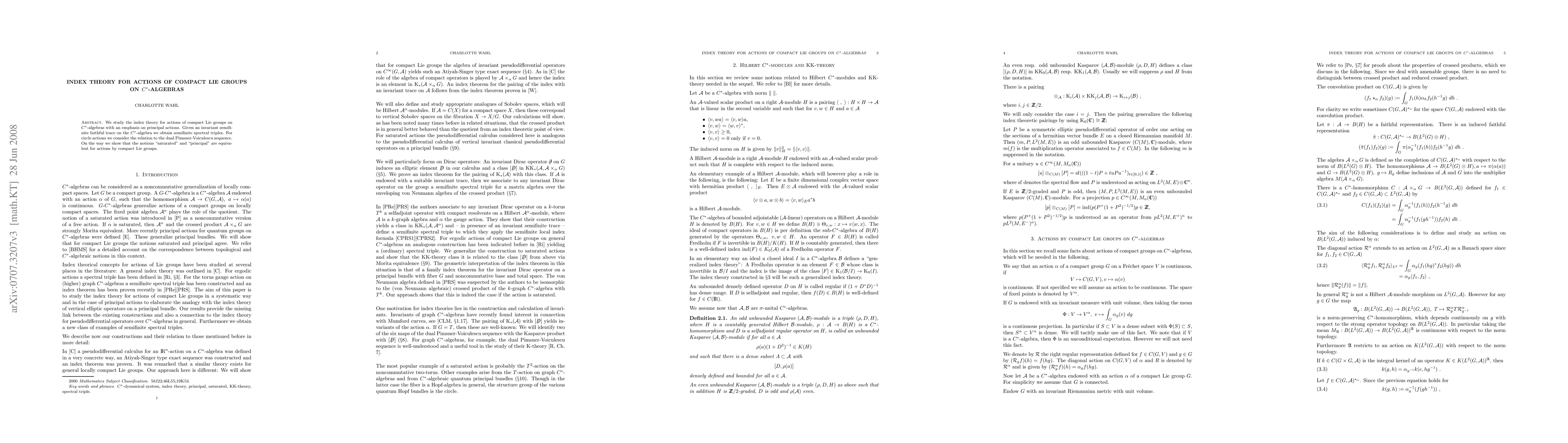 This paper explores index theory for compact Lie group actions on C*-algebras, focusing on principal actions and invariant semifinite traces. It establishes semifinite spectral triples and examines the connection to the dual Pimsner-Voiculescu sequence for circle actions, demonstrating equivalence between "saturated" and "principal" actions.