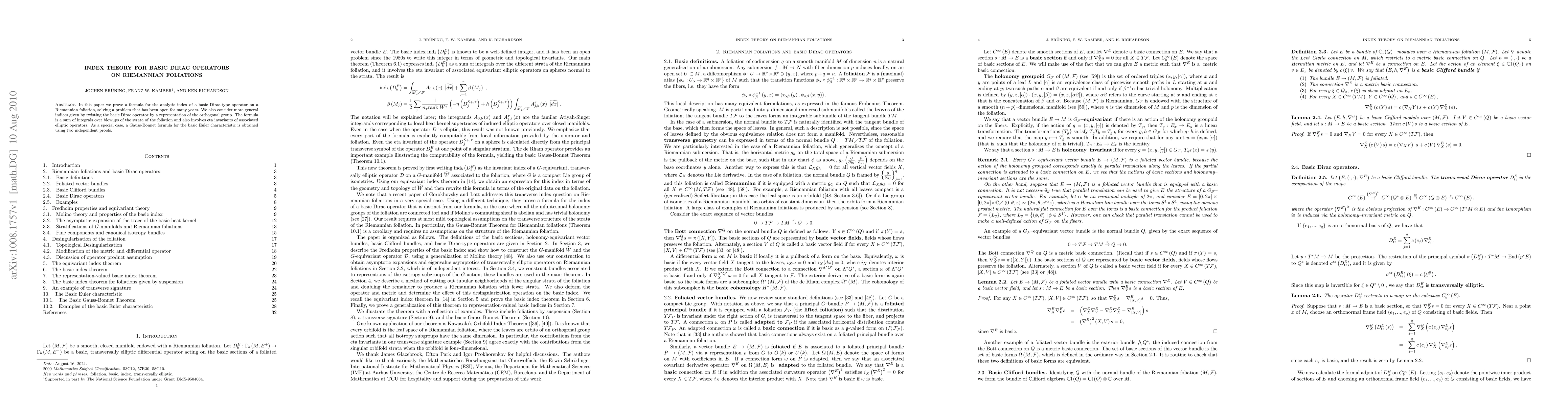 This paper establishes a formula for the analytic index of basic Dirac operators on Riemannian foliations, solving a long-standing open problem. It also extends the formula to more general indices involving representations of the orthogonal group, utilizing integrals over blowups of foliation strata and eta invariants.