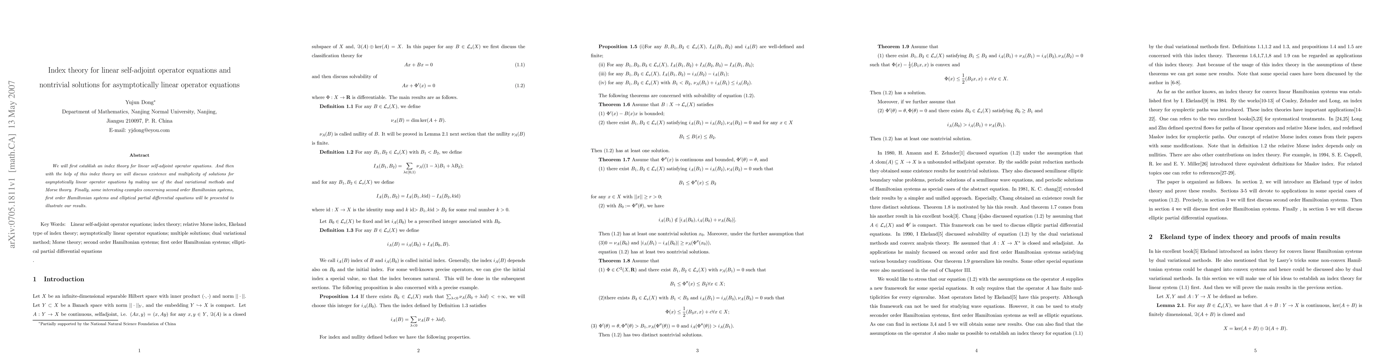 This paper develops an index theory for linear self-adjoint operator equations and uses it to explore the existence and multiplicity of solutions for asymptotically linear operator equations via dual variational methods and Morse theory. Examples from Hamiltonian systems and partial differential equations are provided to demonstrate the results.