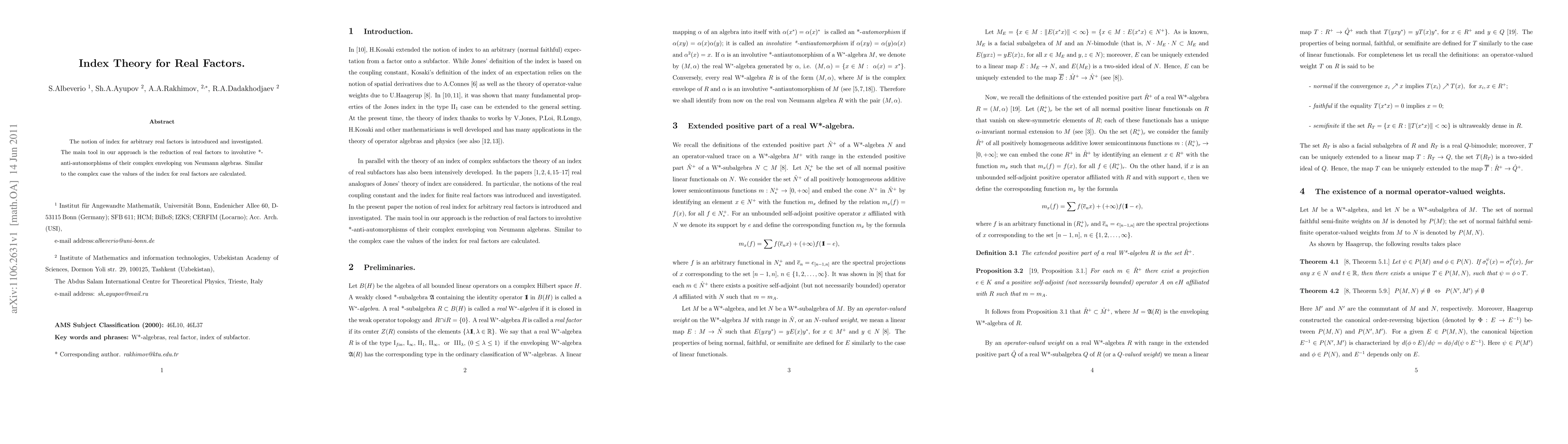 The notion of index for arbitrary real factors is introduced and investigated. The main tool in our approach is the reduction of real factors to involutive *-anti-automorphisms of their complex enveloping von Neumann algebras. Similar to the complex case the values of the index for real factors are calculated.