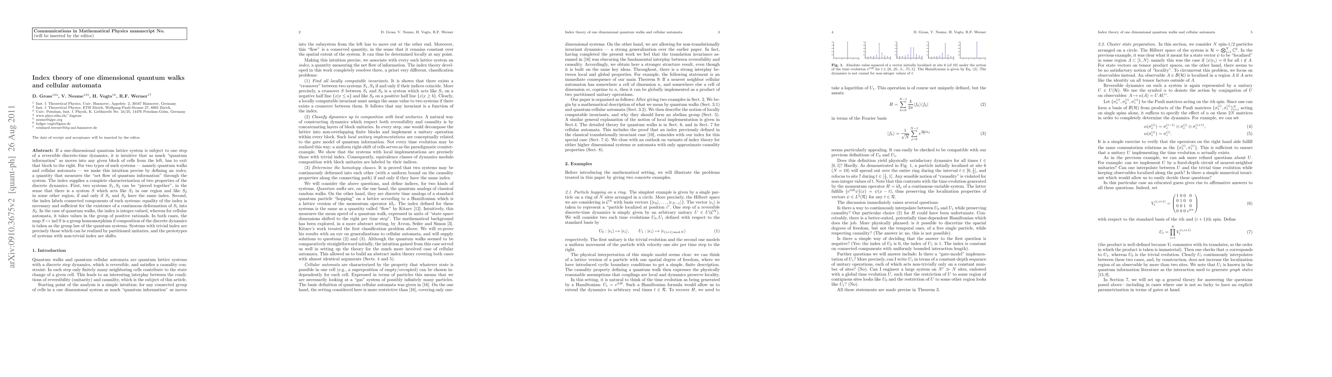 If a one-dimensional quantum lattice system is subject to one step of a reversible discrete-time dynamics, it is intuitive that as much "quantum information" as moves into any given block of cells from the left, has to exit that block to the right. For two types of such systems - namely quantum walks and cellular automata - we make this intuition precise by defining an index, a quantity that measures the "net flow of quantum information" through the system. The index supplies a complete characterization of two properties of the discrete dynamics. First, two systems S_1, S_2 can be pieced together, in the sense that there is a system S which locally acts like S_1 in one region and like S_2 in some other region, if and only if S_1 and S_2 have the same index. Second, the index labels connected components of such systems: equality of the index is necessary and sufficient for the existence of a continuous deformation of S_1 into S_2. In the case of quantum walks, the index is integer-valued, whereas for cellular automata, it takes values in the group of positive rationals. In both cases, the map S -> ind S is a group homomorphism if composition of the discrete dynamics is taken as the group law of the quantum systems. Systems with trivial index are precisely those which can be realized by partitioned unitaries, and the prototypes of systems with non-trivial index are shifts.