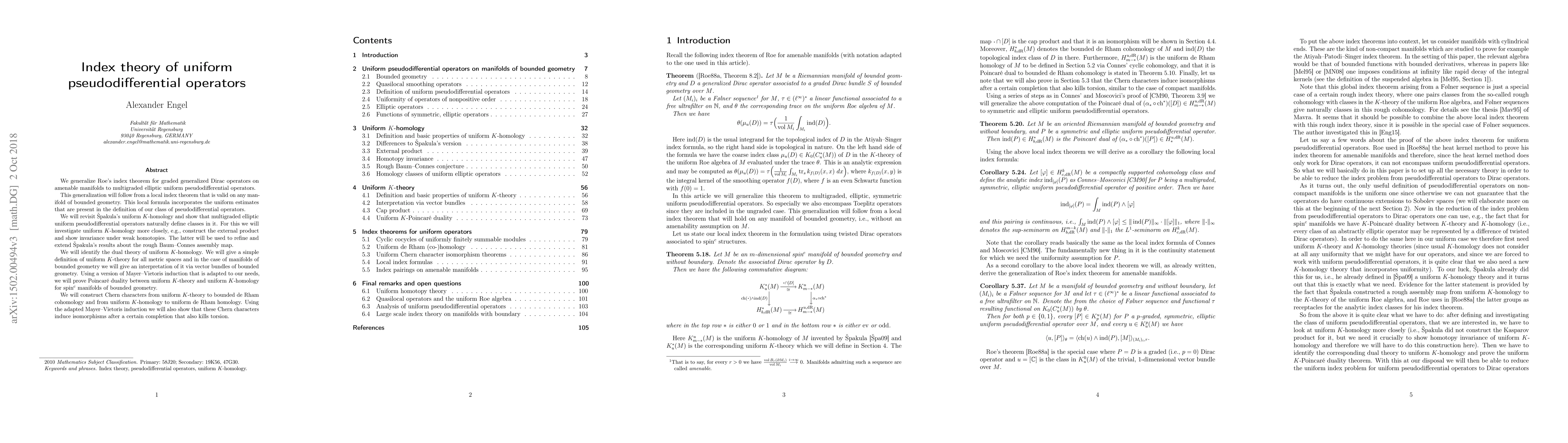 We generalize Roe's index theorem for graded generalized Dirac operators on amenable manifolds to multigraded elliptic uniform pseudodifferential operators. This generalization will follow as a corollary from a local index theorem that is valid on any manifold of bounded geometry. This local formula incorporates the uniform estimates that are present in the definition of our class of pseudodifferential operators which is more general than similar classes defined by other authors. We will revisit Spakula's uniform K-homology and show that multigraded elliptic uniform pseudodifferential operators naturally define classes in it. For this we will investigate uniform K-homology more closely, e.g., construct the external product and show invariance under weak homotopies. The latter will be used to refine and extend Spakula's results about the rough Baum-Connes assembly map. We will identify the dual theory of uniform K-homology. We will give a simple definition of uniform K-theory for all metric spaces and in the case of manifolds of bounded geometry we will give an interpretation of it via vector bundles of bounded geometry. Using a version of Mayer-Vietoris induction that is adapted to our needs, we will prove Poincare duality between uniform K-theory and uniform K-homology for spin-c manifolds of bounded geometry. We will construct Chern characters from uniform K-theory to bounded de Rham cohomology and from uniform K-homology to uniform de Rham homology. Using the adapted Mayer-Vietoris induction we will also show that these Chern characters induce isomorphisms modulo torsion.