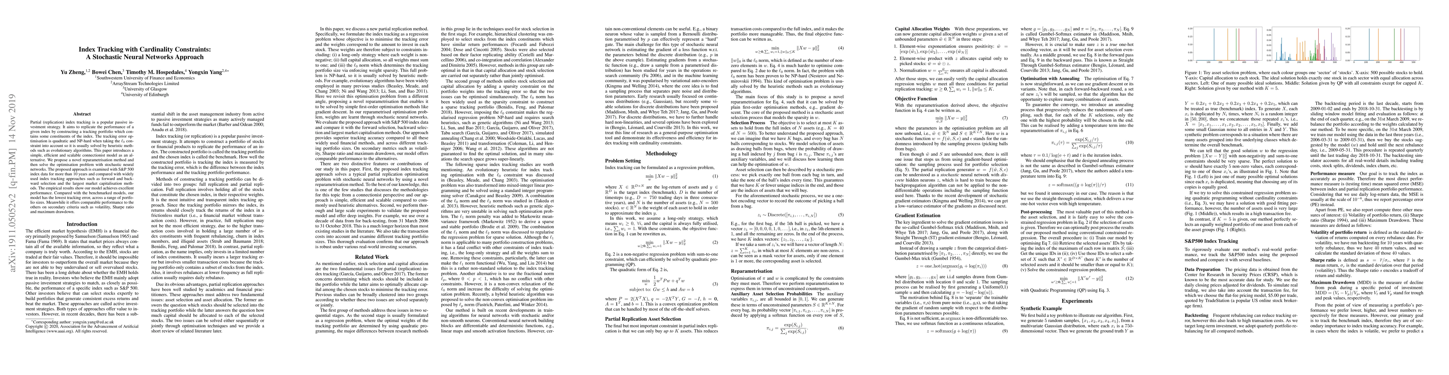 This paper proposes a novel stochastic neural network approach for index tracking with cardinality constraints, outperforming traditional heuristic methods in terms of tracking error and scalability while maintaining comparable performance on other criteria. The effectiveness of the model is demonstrated using S&P 500 index data over a decade.