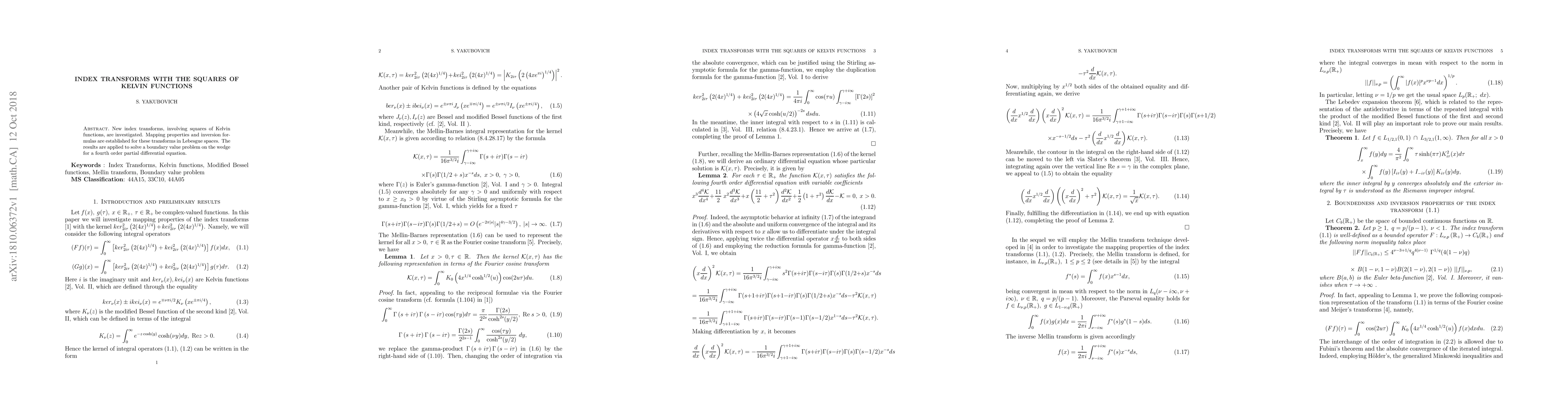 New index transforms, involving squares of Kelvin functions, are investigated. Mapping properties and inversion formulas are established for these transforms in Lebesgue spaces. The results are applied to solve a boundary value problem on the wedge for a fourth order partial differential equation.