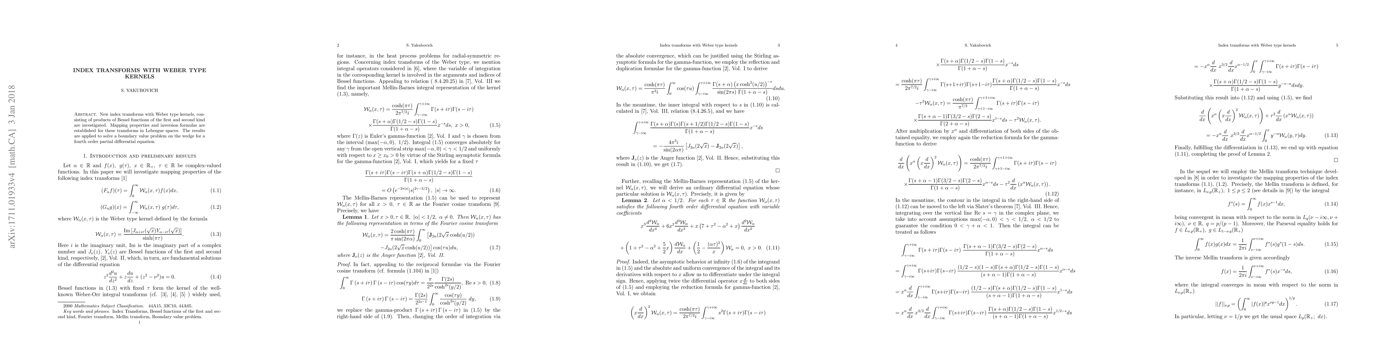 New index transforms with Weber type kernels, consisting of products of Bessel functions of the first and second kind are investigated. Mapping properties and inversion formulas are established for these transforms in Lebesgue spaces. The results are applied to solve a boundary value problem on the wedge for a fourth order partial differential equation.