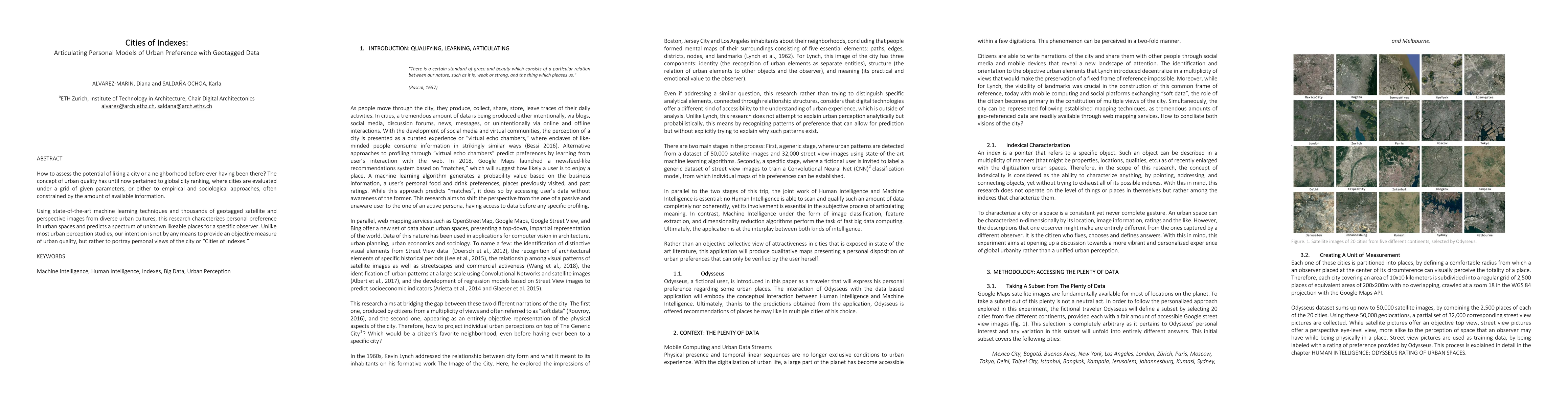 How to assess the potential of liking a city or a neighborhood before ever having been there. The concept of urban quality has until now pertained to global city ranking, where cities are evaluated under a grid of given parameters, or either to empirical and sociological approaches, often constrained by the amount of available information. Using state of the art machine learning techniques and thousands of geotagged satellite and perspective images from diverse urban cultures, this research characterizes personal preference in urban spaces and predicts a spectrum of unknown likeable places for a specific observer. Unlike most urban perception studies, our intention is not by any means to provide an objective measure of urban quality, but rather to portray personal views of the city or Cities of Indexes.