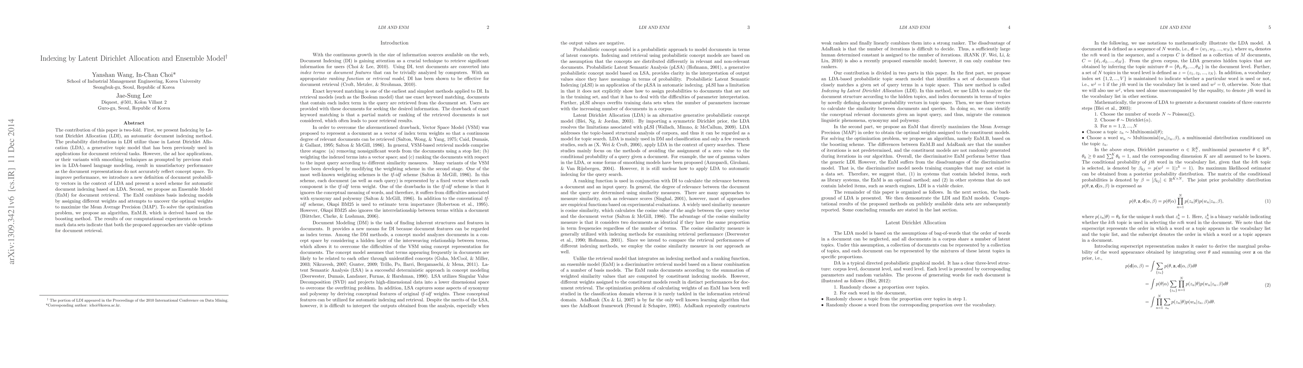This paper introduces Indexing by Latent Dirichlet Allocation (LDI) for automatic document indexing and proposes an Ensemble Model (EnM) for document retrieval, both showing improved performance on benchmark datasets. The LDI redefines document probability vectors, while the EnM optimizes model weights to maximize Mean Average Precision.
