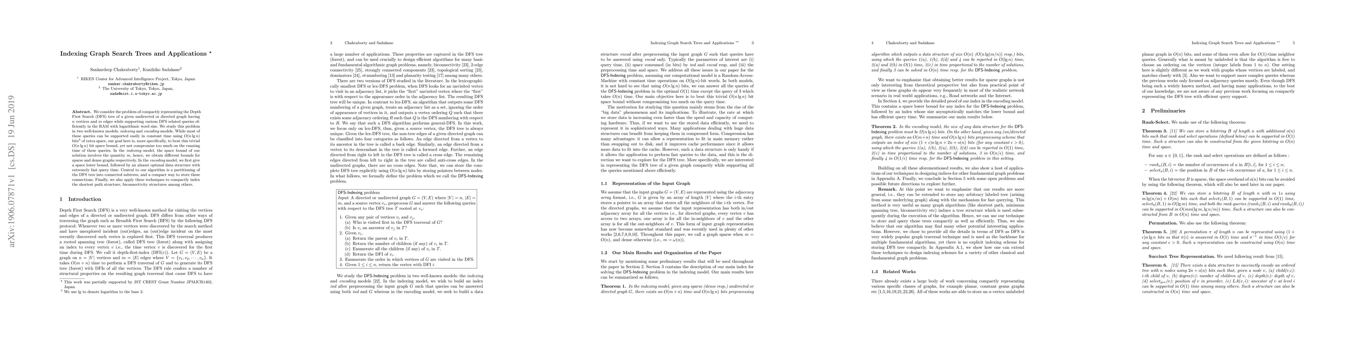 We consider the problem of compactly representing the Depth First Search (DFS) tree of a given undirected or directed graph having $n$ vertices and $m$ edges while supporting various DFS related queries efficiently in the RAM with logarithmic word size. We study this problem in two well-known models: {\it indexing} and {\it encoding} models. While most of these queries can be supported easily in constant time using $O(n \lg n)$ bits\footnote{We use $\lg$ to denote logarithm to the base $2$.} of extra space, our goal here is, more specifically, to beat this trivial $O(n \lg n)$ bit space bound, yet not compromise too much on the running time of these queries. In the {\it indexing} model, the space bound of our solution involves the quantity $m$, hence, we obtain different bounds for sparse and dense graphs respectively. In the {\it encoding} model, we first give a space lower bound, followed by an almost optimal data structure with extremely fast query time. Central to our algorithm is a partitioning of the DFS tree into connected subtrees, and a compact way to store these connections. Finally, we also apply these techniques to compactly index the shortest path structure, biconnectivity structures among others.