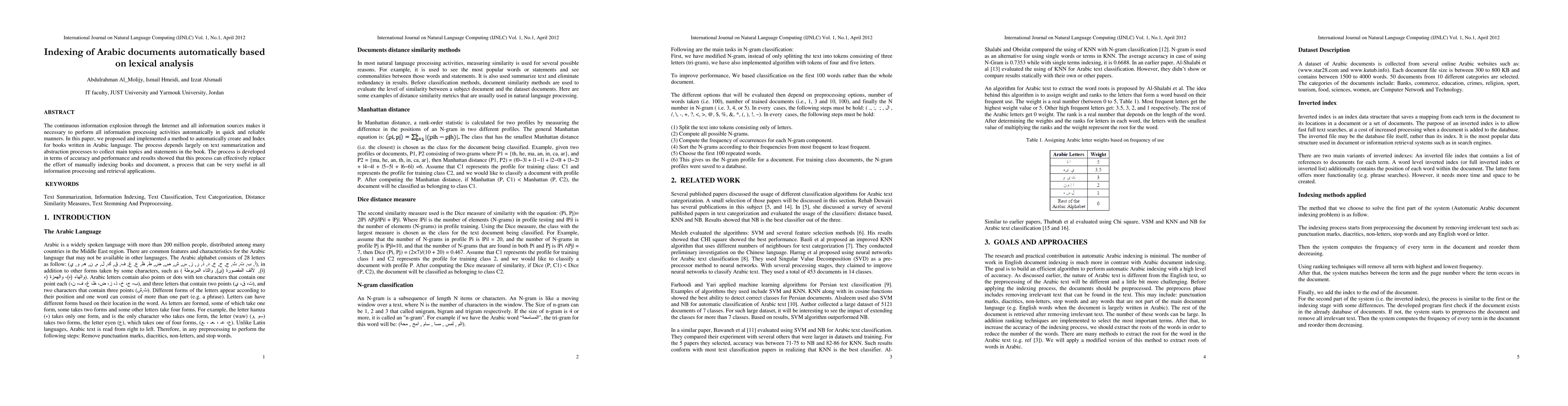 The research proposes an automatic method for indexing Arabic documents using lexical analysis, focusing on text summarization and abstraction to collect main topics and statements. The process involves modifying N-gram classification with tokens of 3 to 5 letters and basing classification on the first 100 words of a document. Preprocessing steps include removing irrelevant text such as punctuation, diacritics, non-letters, stop words, and foreign words.