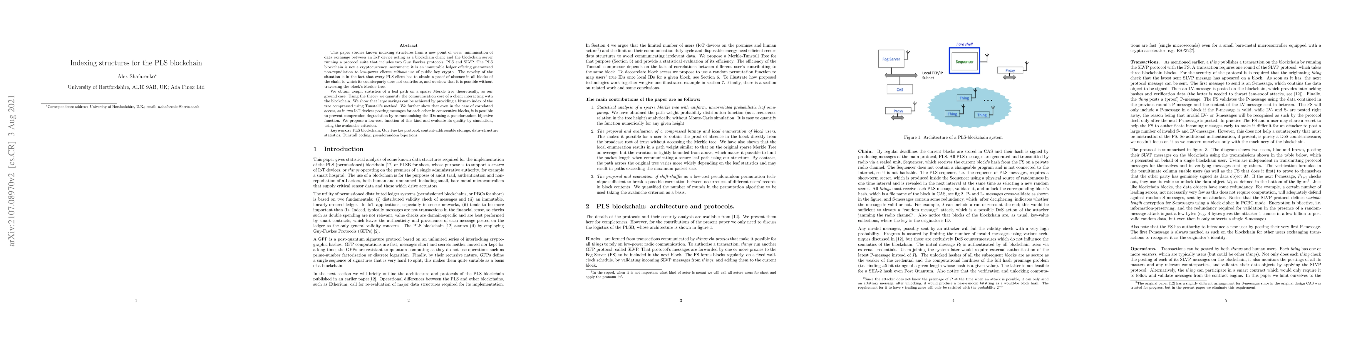 This paper studies known indexing structures from a new point of view: minimisation of data exchange between an IoT device acting as a blockchain client and the blockchain server running a protocol suite that includes two Guy Fawkes protocols, PLS and SLVP. The PLS blockchain is not a cryptocurrency instrument; it is an immutable ledger offering guaranteed non-repudiation to low-power clients without use of public key crypto. The novelty of the situation is in the fact that every PLS client has to obtain a proof of absence in all blocks of the chain to which its counterparty does not contribute, and we show that it is possible without traversing the block's Merkle tree. We obtain weight statistics of a leaf path on a sparse Merkle tree theoretically, as our ground case. Using the theory we quantify the communication cost of a client interacting with the blockchain. We show that large savings can be achieved by providing a bitmap index of the tree compressed using Tunstall's method. We further show that even in the case of correlated access, as in two IoT devices posting messages for each other in consecutive blocks, it is possible to prevent compression degradation by re-randomising the IDs using a pseudorandom bijective function. We propose a low-cost function of this kind and evaluate its quality by simulation, using the avalanche criterion.